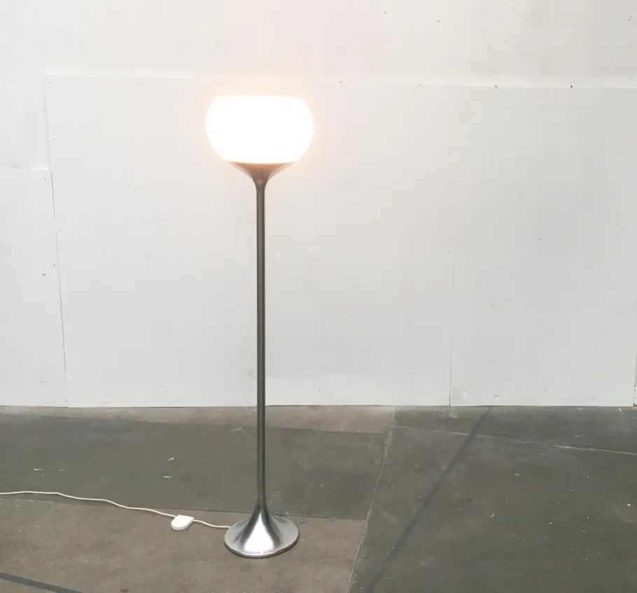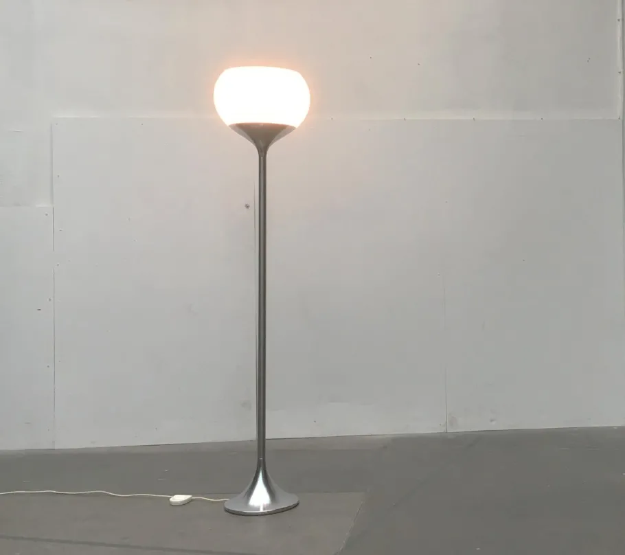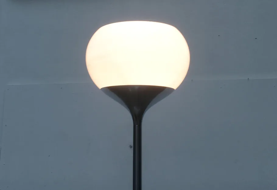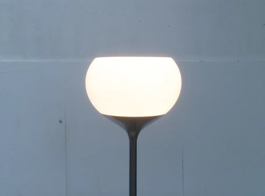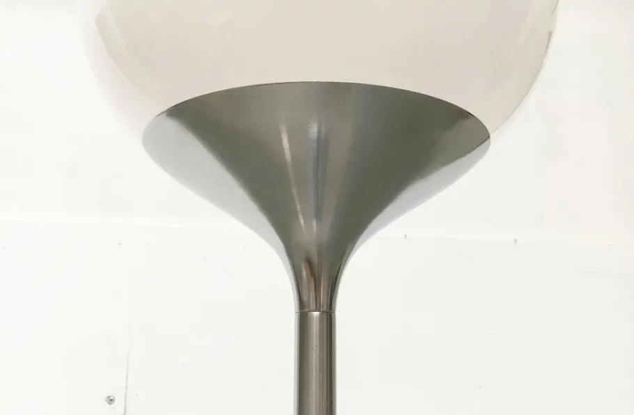 The classic Guzzini plastic shade is turned in this design. The shade is finished in translucent white. The base consists of a stem that is tulip shaped on both sides. At the bottom, to form the foot. Above, to receive the shade flush.