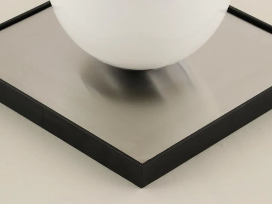 Frame in black metal topped with a stainless steel plate on which the large white opaline glass ball is mounted.