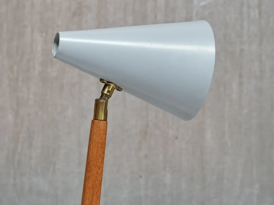 The design is defined by its solid oak frame, consisting of a circular base and a geometric, tapered column set at a slight angle. A brass joint connects the column to the shade, allowing for easy adjustment of the light direction. The cone-shaped shade, crafted from metal and lacquered in a soft light grey, creates a refined contrast with the warmth of the wood. The lamp is operated via a small push-button switch integrated into the wooden base, adding to its minimalist functionality.