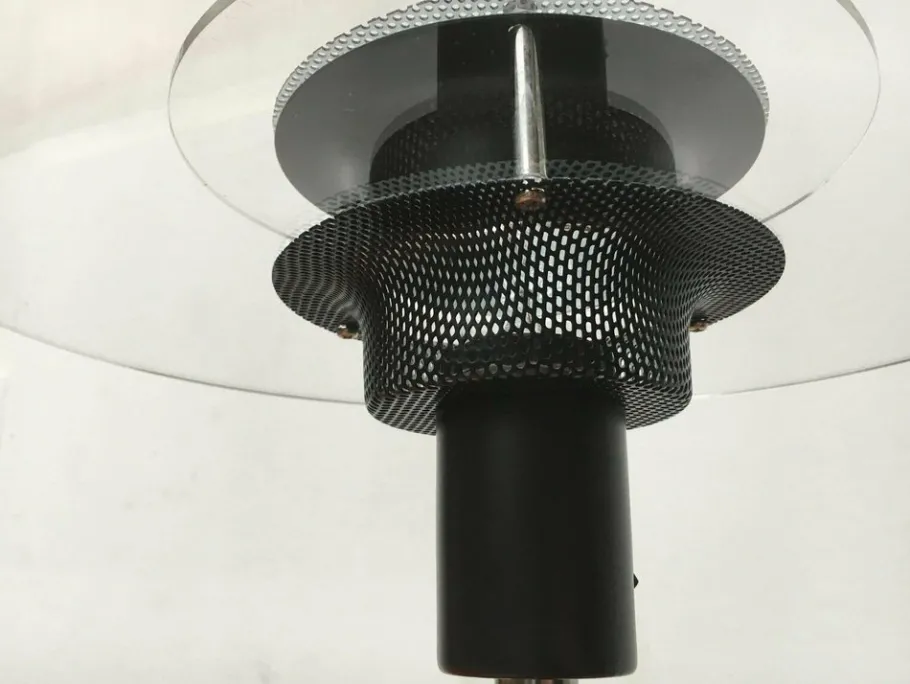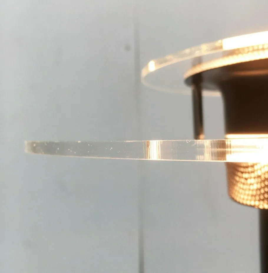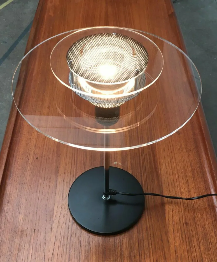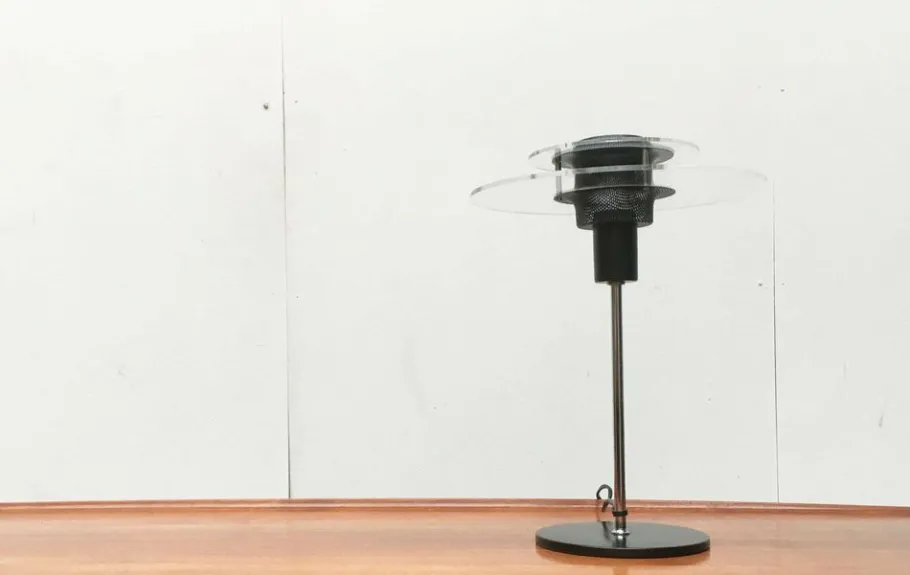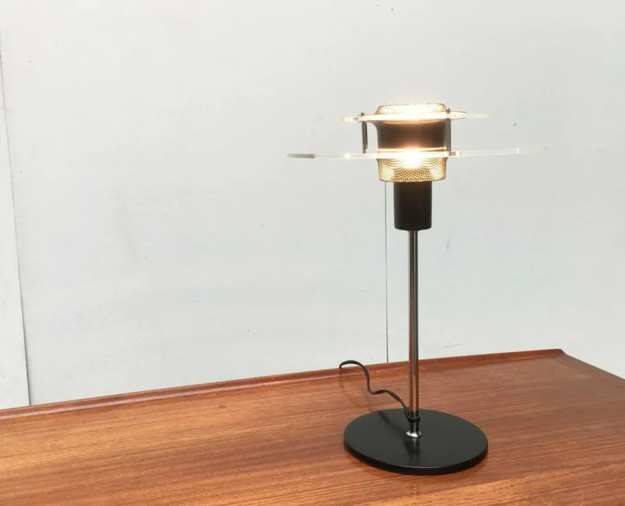 Elegant table lamp with a technical design language. The flat lighting head looks particularly narrow in the profile. The color range is striking in black and chrome. In addition, transparent acrylic elements as reflectors and perforated sheet details. Characteristic materials and colors of the 80s. The lamp is shielded inside the lamp and the light steps over the acrylic disks and the perforated plate to the outside.