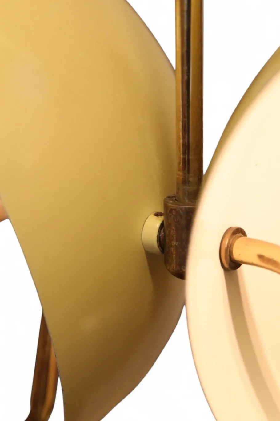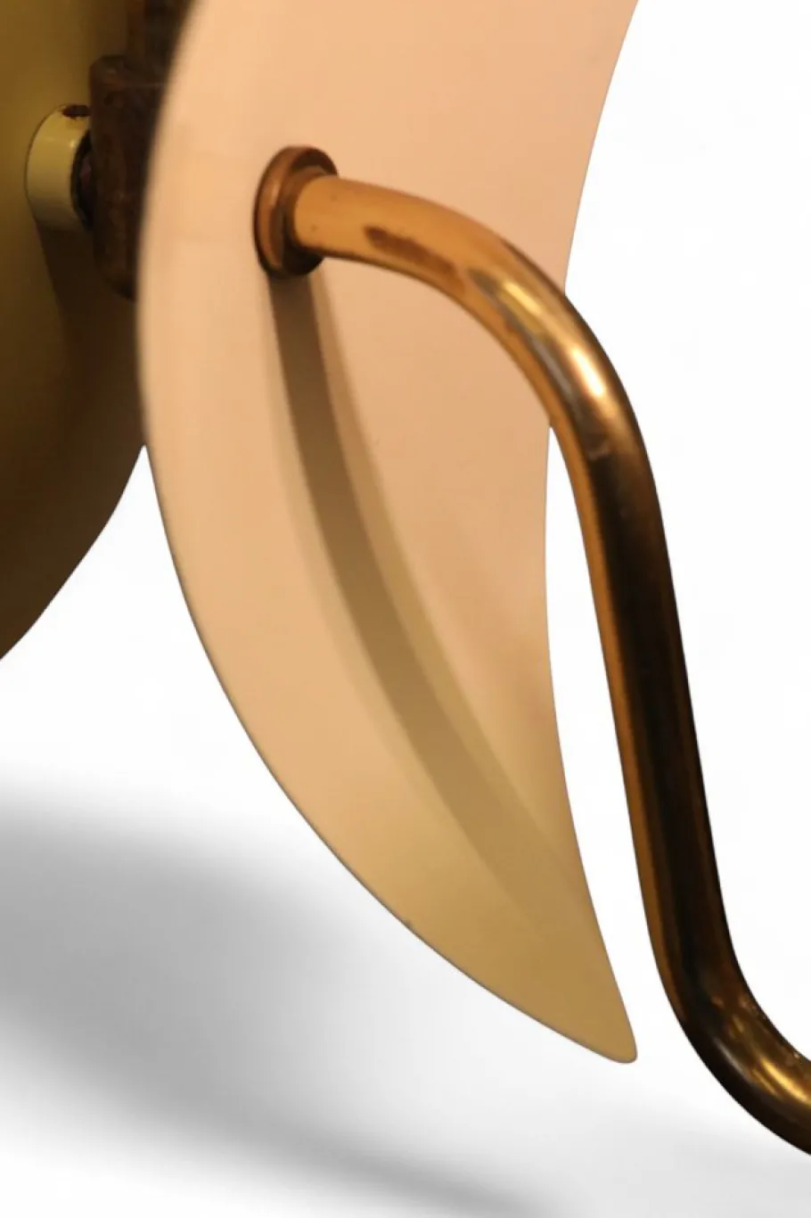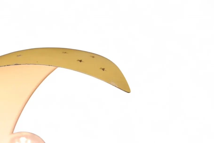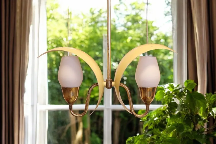 The lamp has a brass frame with two leaf-like shades with stars cut out on the top. The top of the leaves are gold-lacquered and the bottom is white-lacquered. The lamp has opal glass shades that spread a soft and pleasant glow.