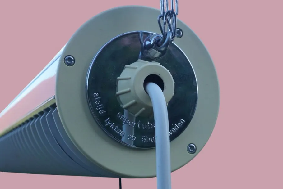 | Restoration and Damage Details | Requires rewiring and/or new electrical parts, Light wear consistent with age and use, Die Endkappen der Lampe sind nicht reinriss wie die Lampe. Diese sind eher cremeweiss. Elektrik ist noch original. Ergänzt wurden die Ketten durch hochwertige Ketten aus V2A. Die Schnur des Schnurschalter wurde ebenfalls ergänzt. Lackschäden sind vorhande |