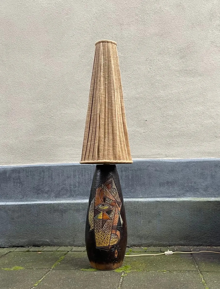 | Restoration and Damage Details | Light wear consistent with age and use, Patina consistent with age and use, Well-kept and intact ceramic body/base, The 60 year old hessian shade has a bit of patina and discoloration |