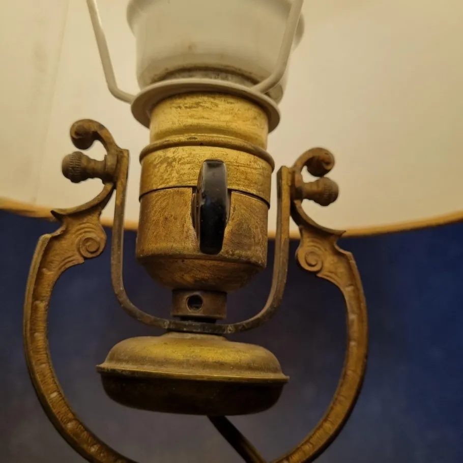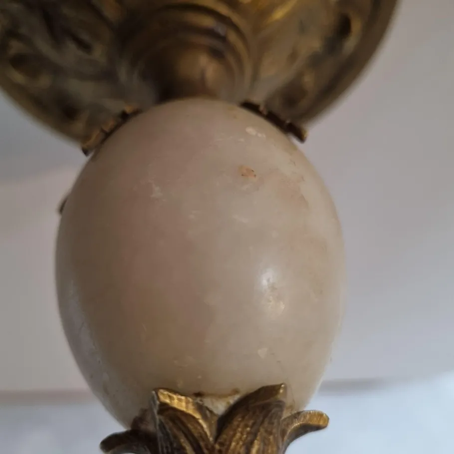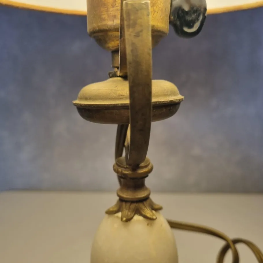 with an oval ball base in ecru marble and a marbled brown cardboard shade.
