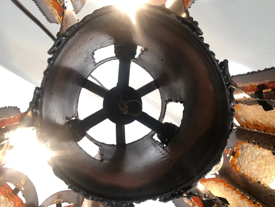 Earthy, very organic and almost Space Age, this copper and cackle glass lantern has a real Brutalist look, like a chandelier you might see hanging in The Barbican or a modernist church. The copper edges are serrated, the panels of the glass textural and rugged. Turned on, its colors burn brightly like a furnace.