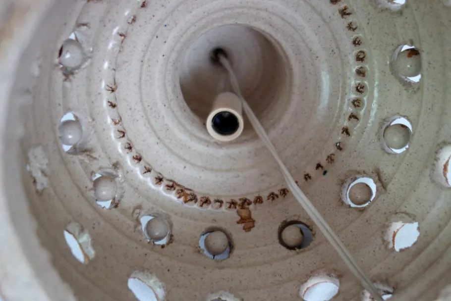 The base is glazed with openwork decorations of pastilles and small circular medallions held by metal wires. Two light sources: an E27 (bayonet) in the shade and an E14 in the base. Beautiful light effects when lit. Sold without the shade. Very good condition.