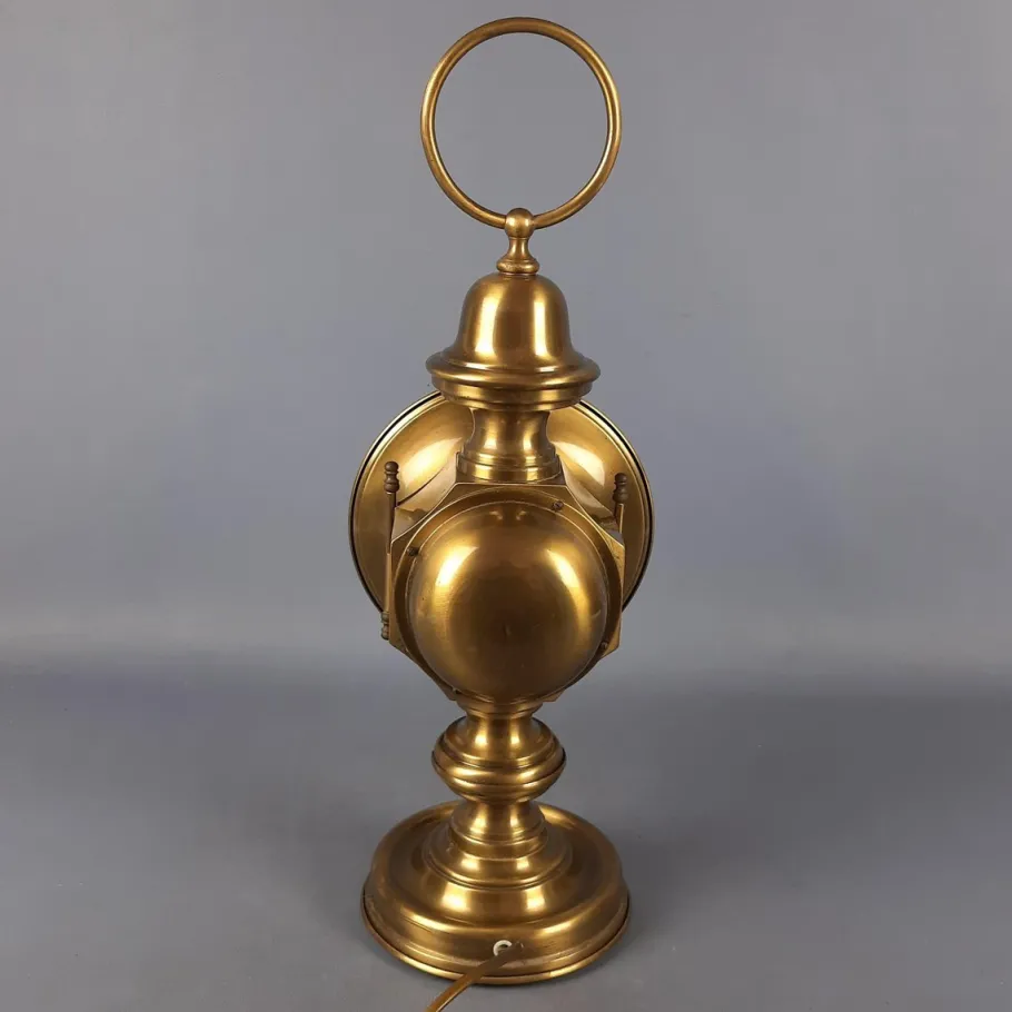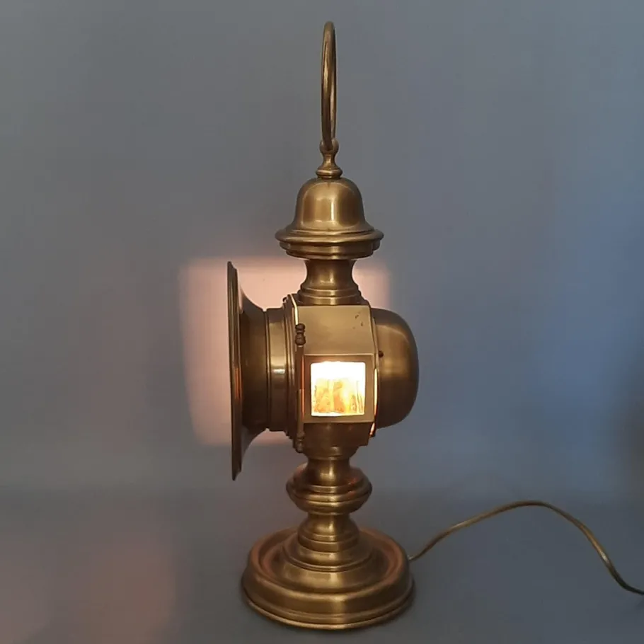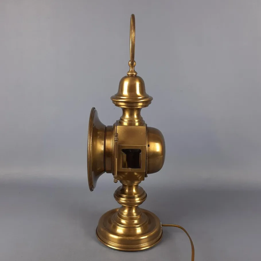 Add a piece of engineering history and a unique design touch to your home with this charming vintage brass table lamp. Its design is clearly inspired by early car and carriage headlights or naval-style lamps, transforming a functional object into a true work of art. Electrified and ready for use, this lamp is a rare piece with great character.