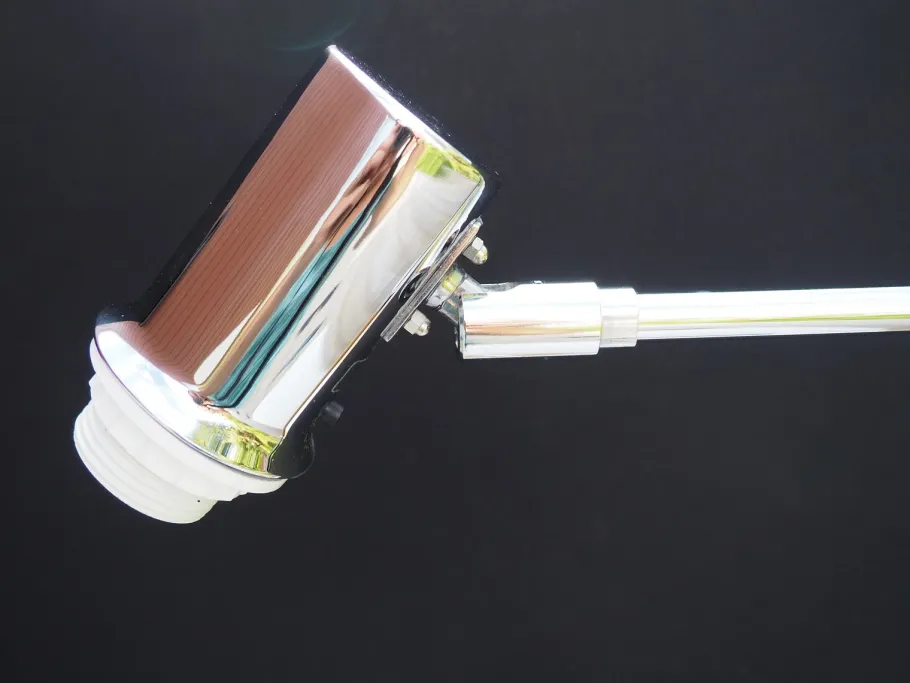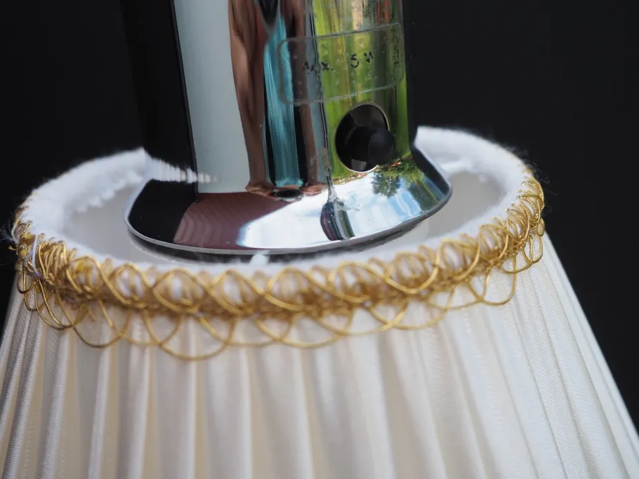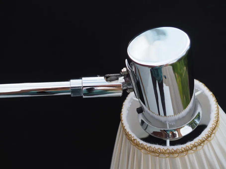 The lamp has an elegant and stylish design with an adjustable arm and pleated lampshade, making it a sought-after vintage item.