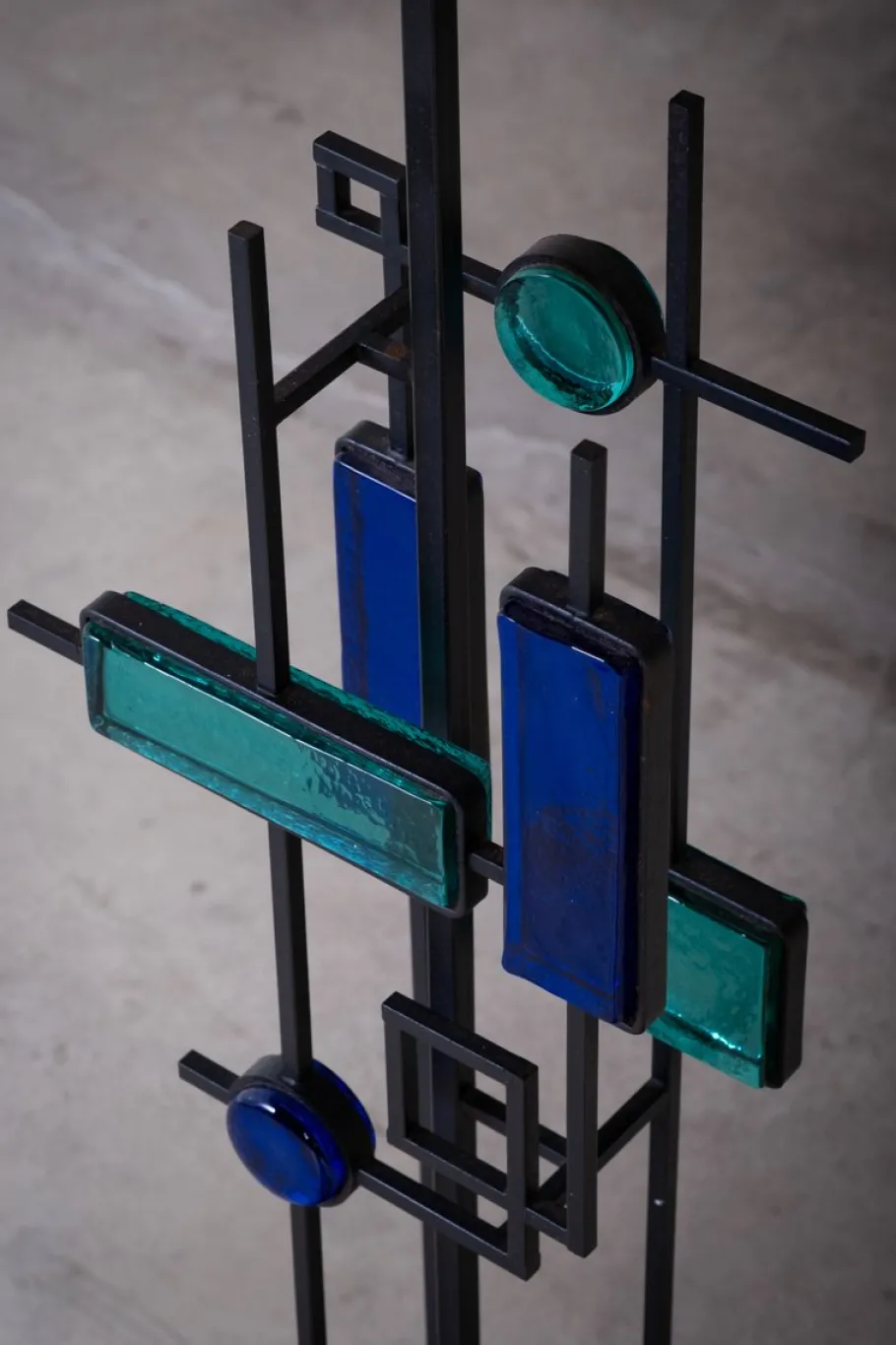 An iron structure made up of horizontal and vertical lines forms a variety of geometric shapes. These shapes create square and rectangular frames, some of them filled with elements of colored glass in warm shades of blue. The base is made of painted pinewood, adding warmth and contrast to the graphic metal frame.