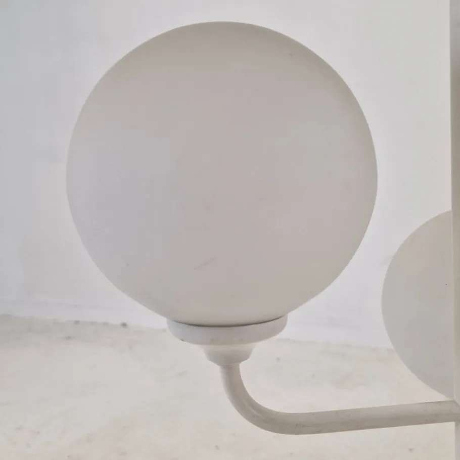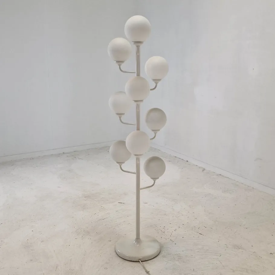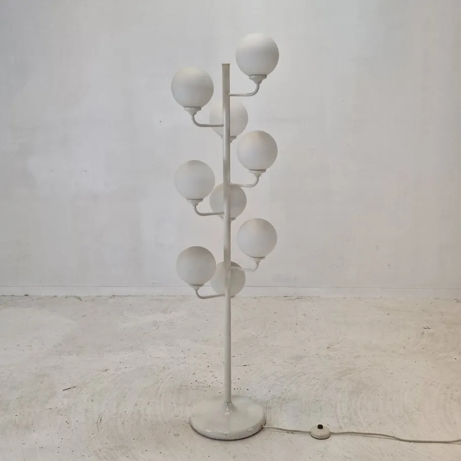 It is fascinating with its Space Age design and nine arms with milk glass balls.