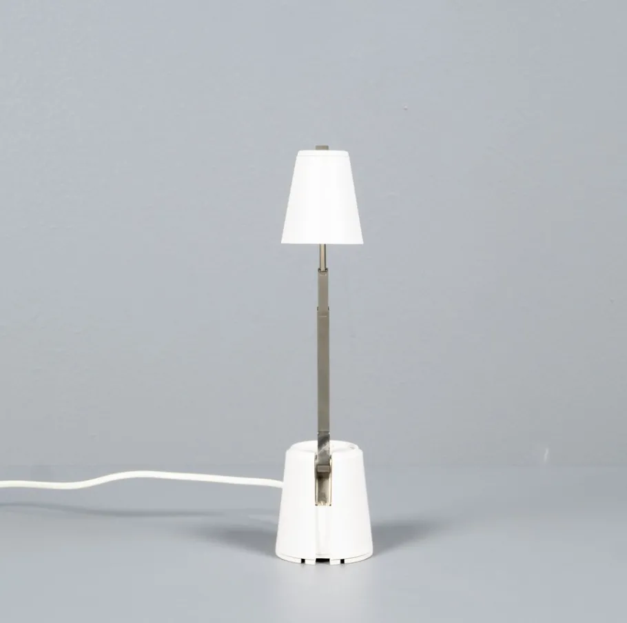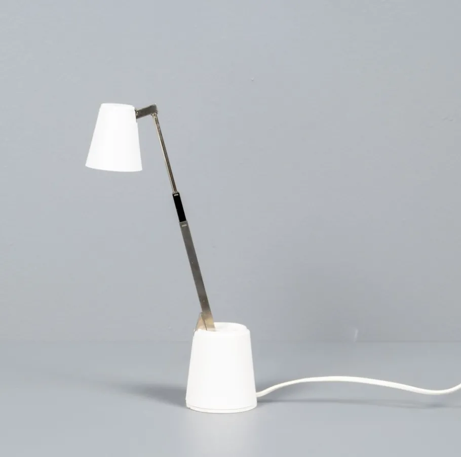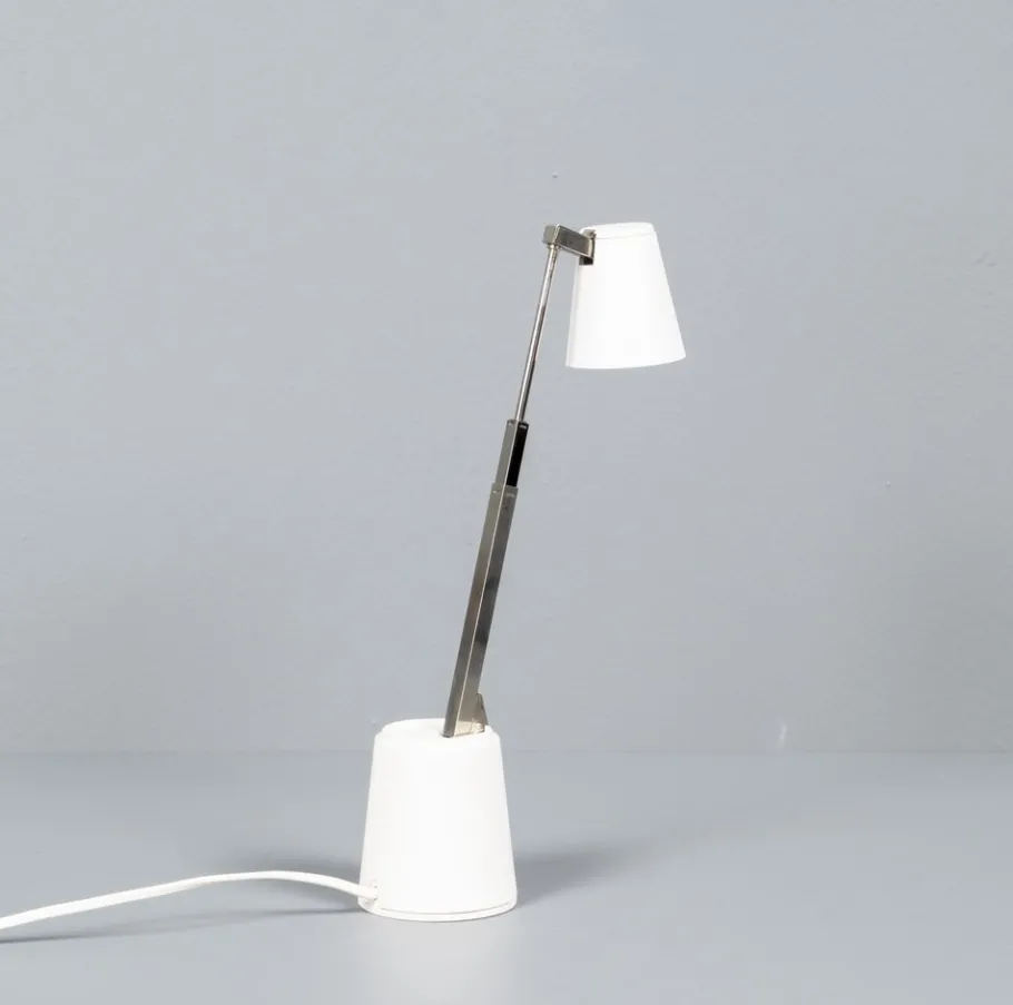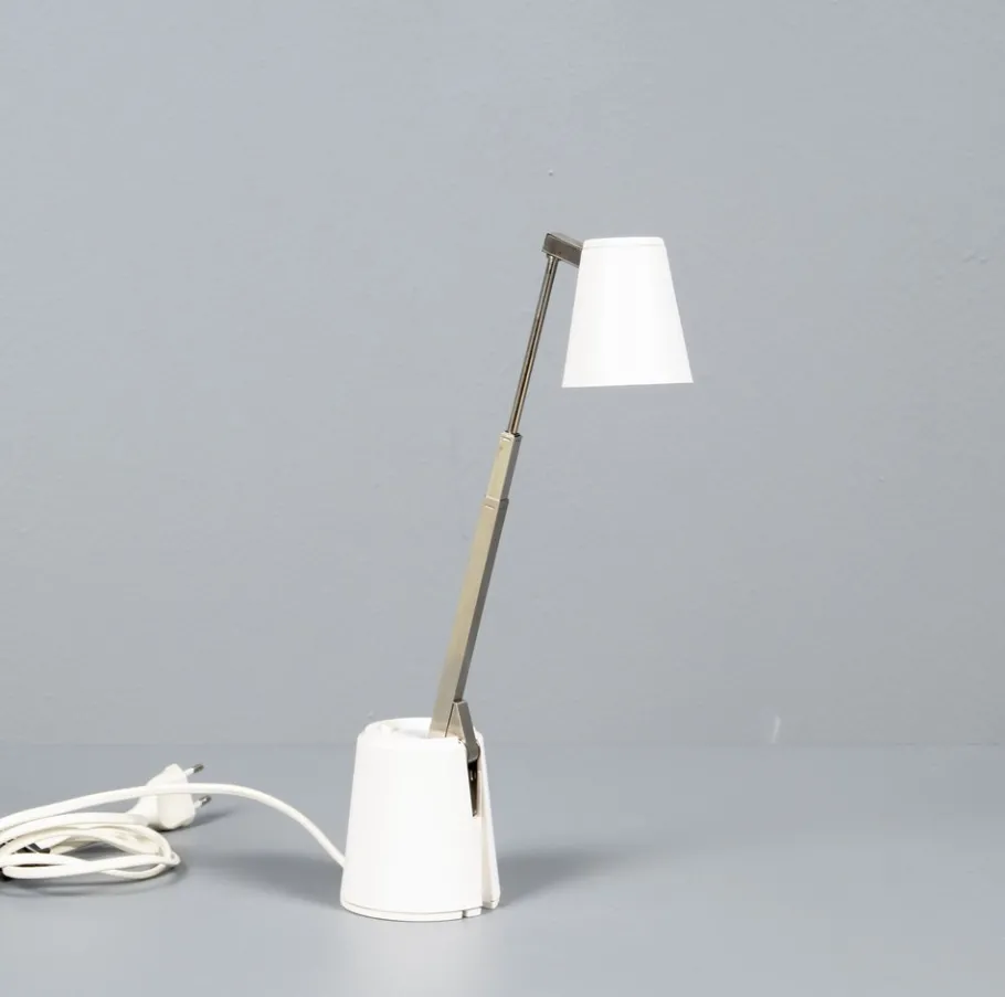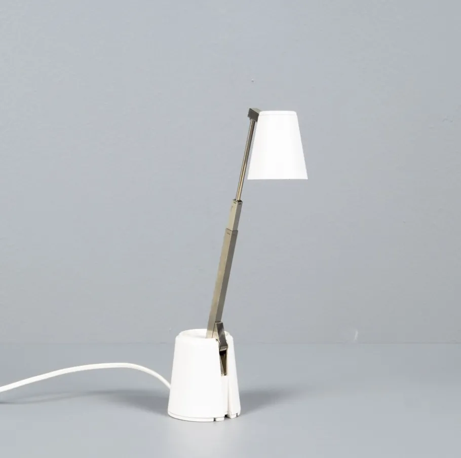 A small piece of German design history by Eichhoff Teleskop Reiselampe Lampette. The head can be rotated and tilted. If necessary, it can be folded up very compactly and taken with you.