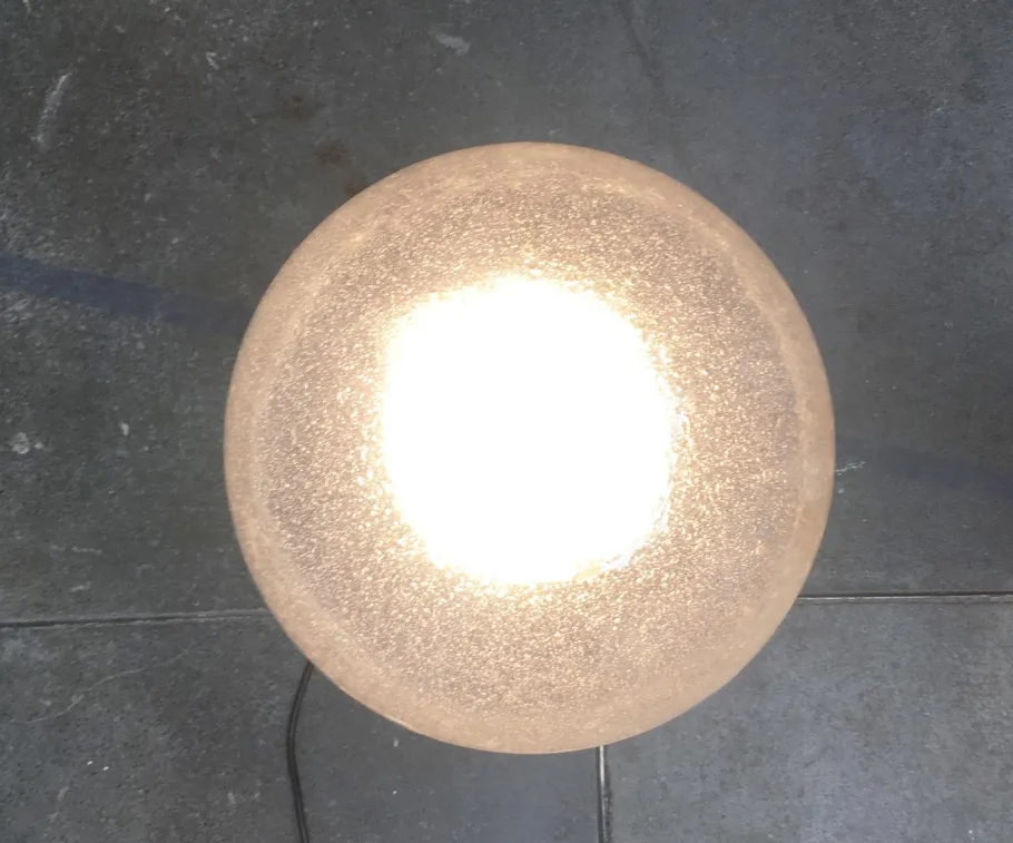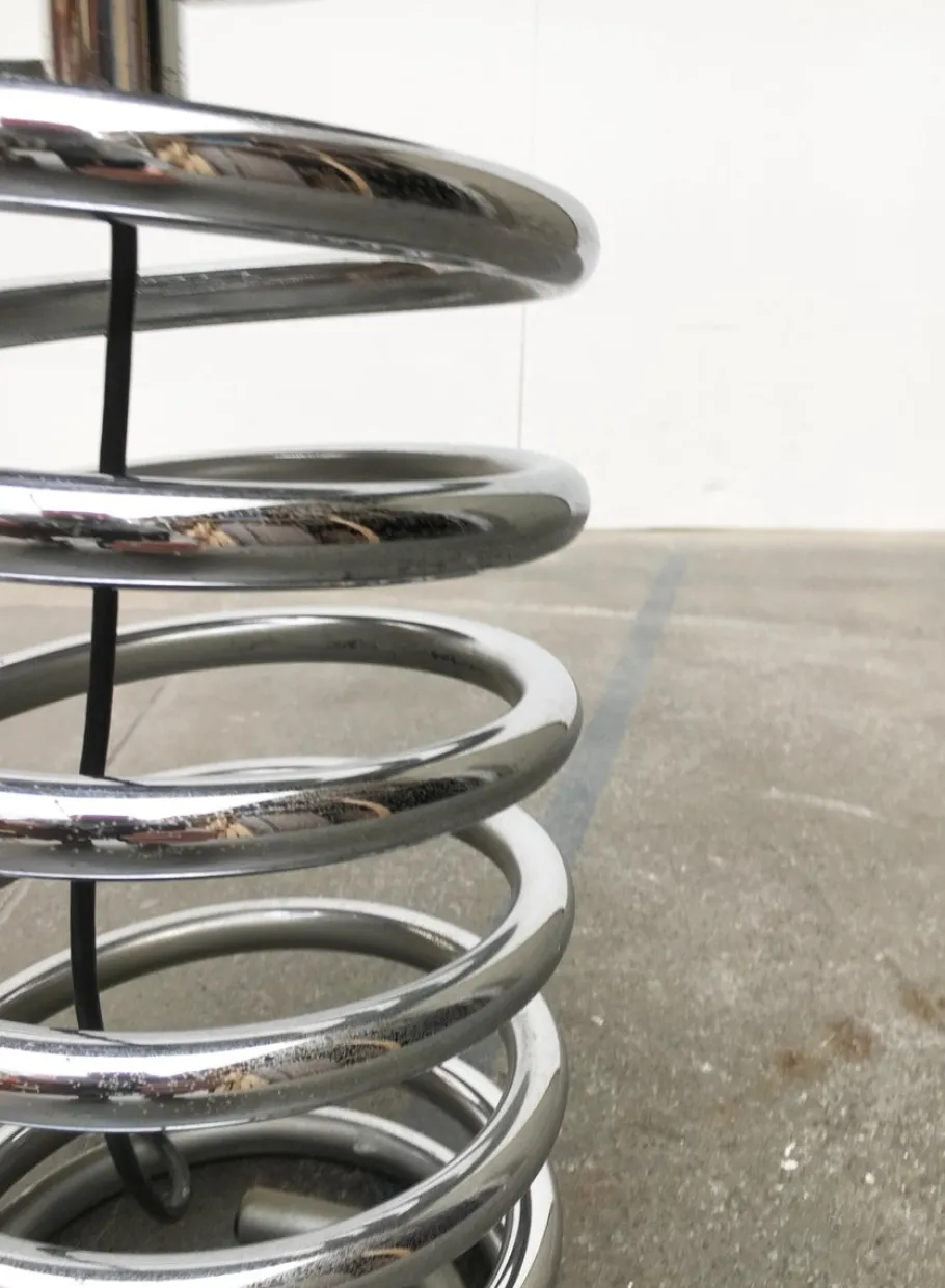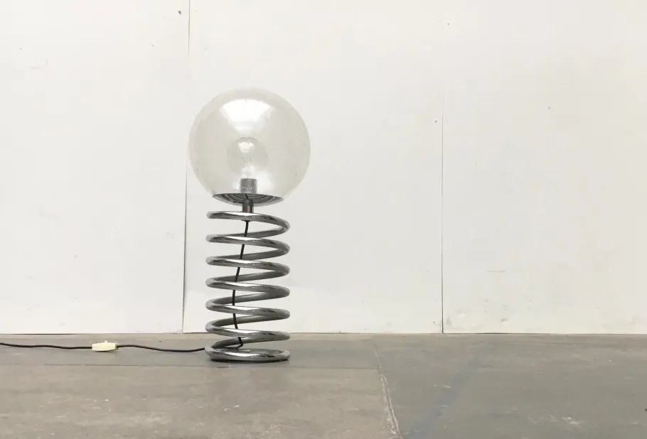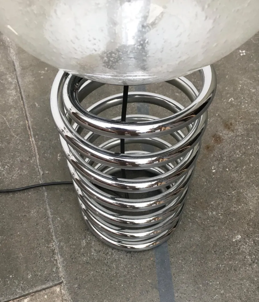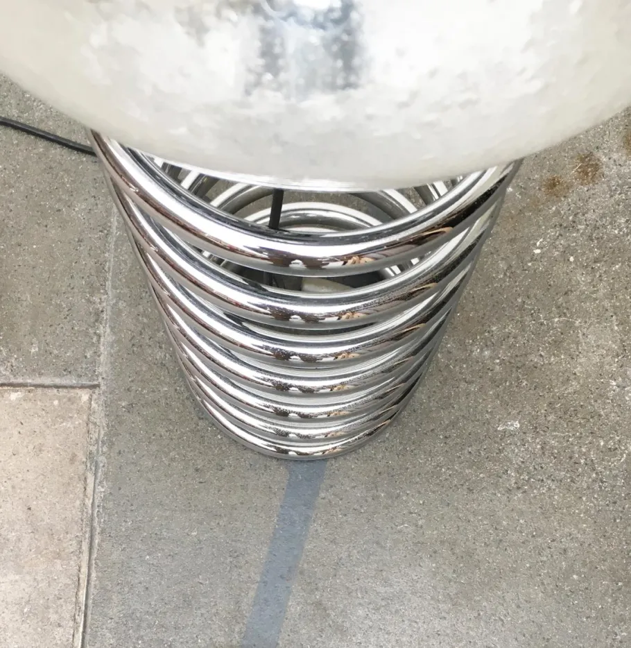 A spherical diffuser is enthroned on a massive, chrome-plated spiral. The glass is structured, which gives the light a special effect. The heaviness of the luminaire is contrasted here by the lightness of the design. The open shape of the spiral, the glass as well as the chrome play with reflection and transparency. The cable runs deliberately visible inside the spiral and emerges from the side. The lamp has a cord switch. The glass is probably not the original glass.