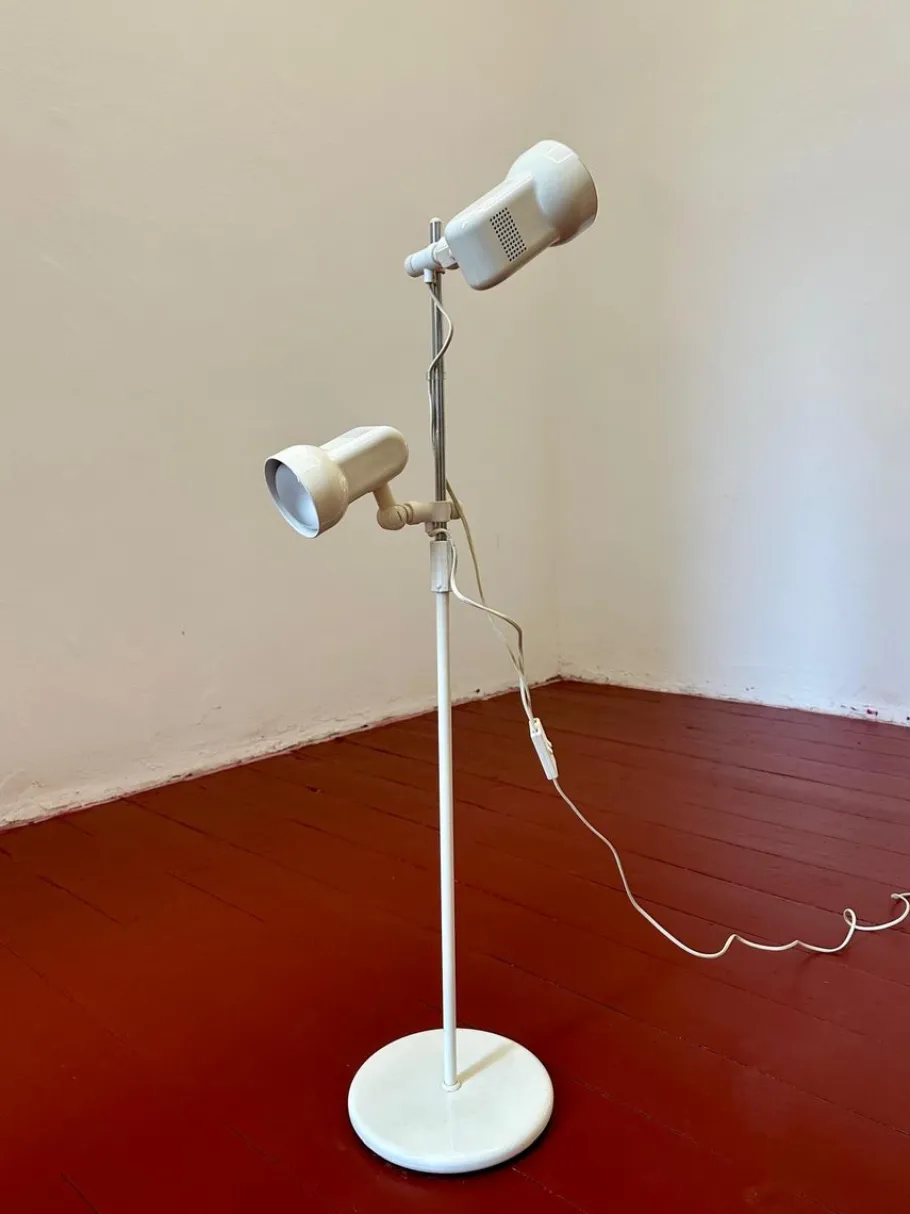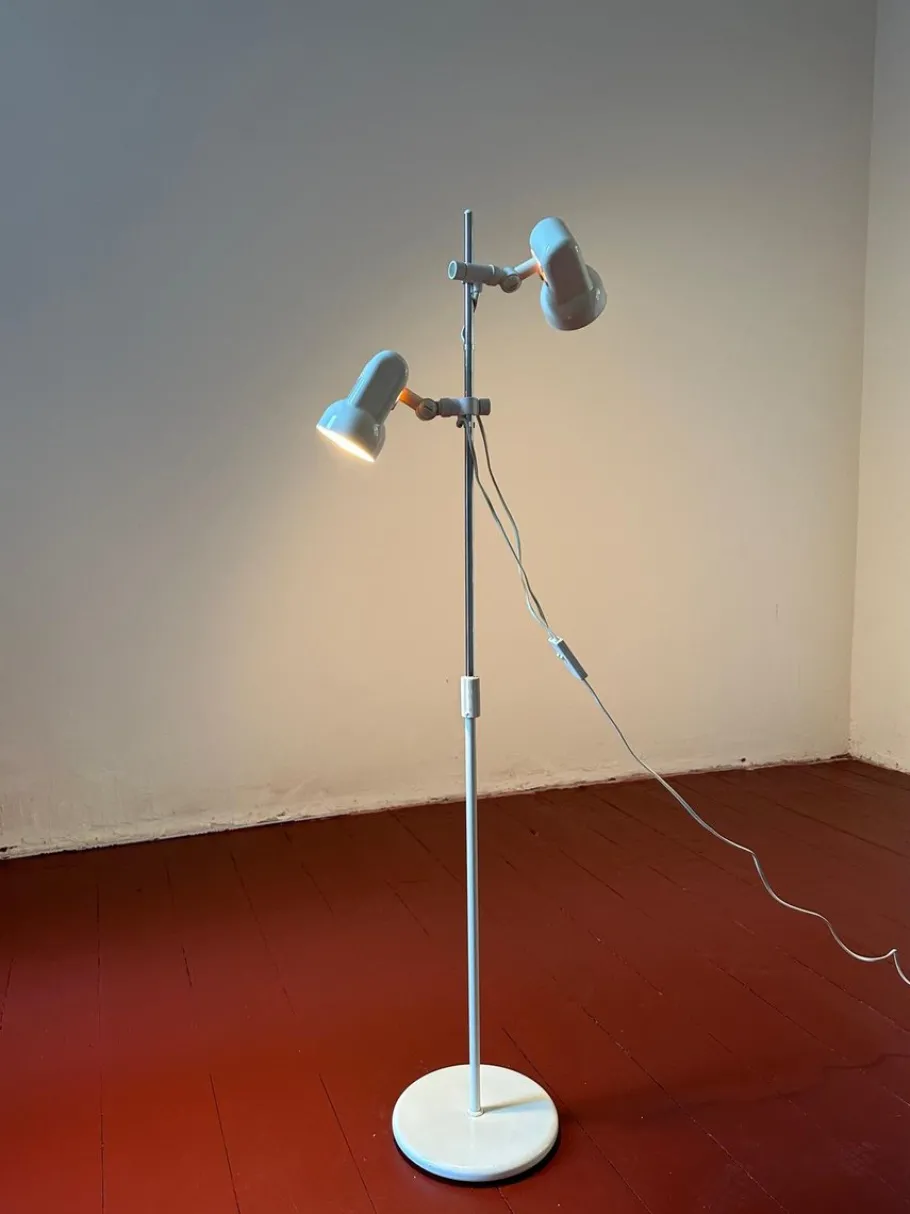 The white circular base adds a graphic contrast to the polished chrome elements, underlining the lamp’s modernist appeal. A versatile and sculptural piece that merges industrial simplicity with mid-century aesthetics.