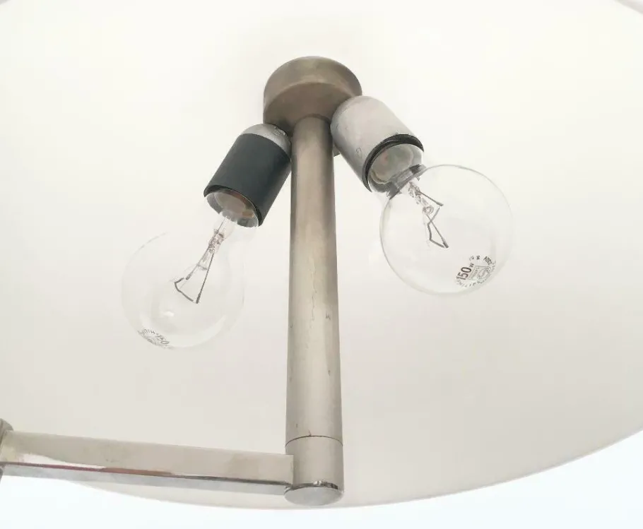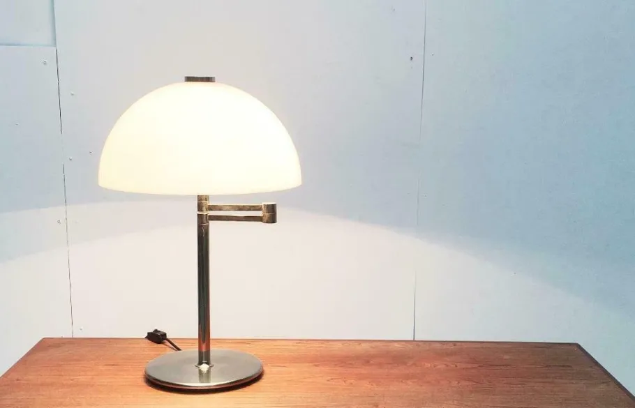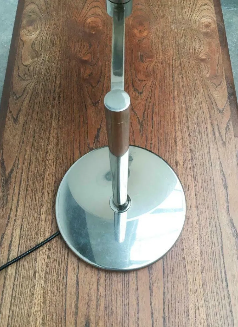 Simple form with function. This heavy table lamp is made of chrome and white. The base is made of chrome and includes the swivel arm function. The range of the light can be easily extended.