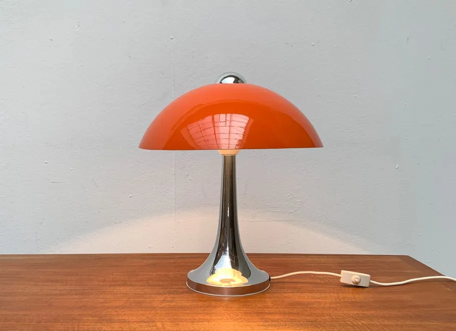 The lamp features a classic mushroom shape. The large metal shade is finished in orange and sits on a trumpet-shaped base. It has an opening at the top center for the bulb. The lamp is predestined for a head-mirrored illuminant, whose mirror emerges on the top of the shade.