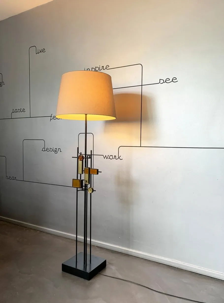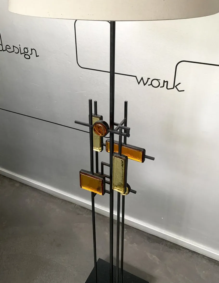 An iron structure made up of horizontal and vertical lines forms a variety of geometric shapes. These shapes create square and rectangular frames, some of them filled with elements of colored glass in shades of yellow and ochre. Base made of painted pinewood.