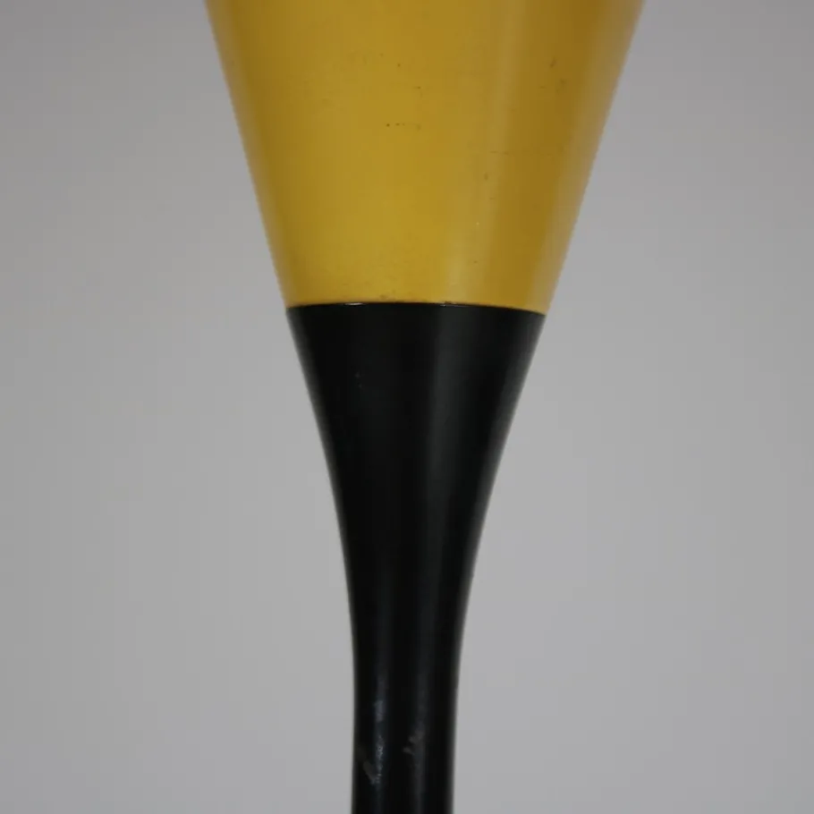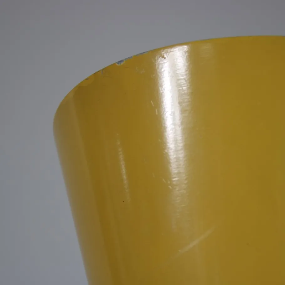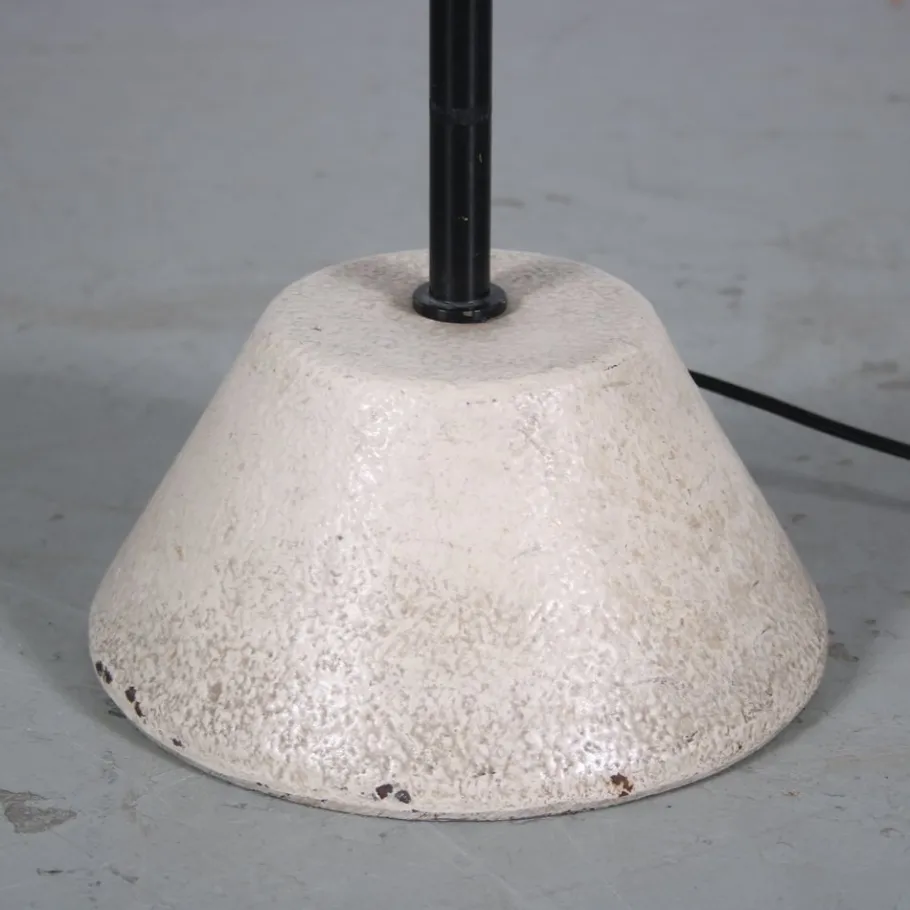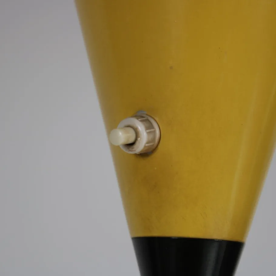 This elegant, minimalist piece has a wonderful appeal that nicely combines colours, materials and shapes. It’s a highly recognizable find that is guaranteed to draw the attention of any design enthusiast! The yellow metal hood adds a pop of color and personality, nicely contrasting to the black lacquered metal arm. The foot is made of cream / white coloured stone, which nicely balances the piece and works really well with the other materials, allowing each element of the piece to truly stand out! The on/off switch is located on the shade for ease of use. When lit, it emits a bright upwards light.