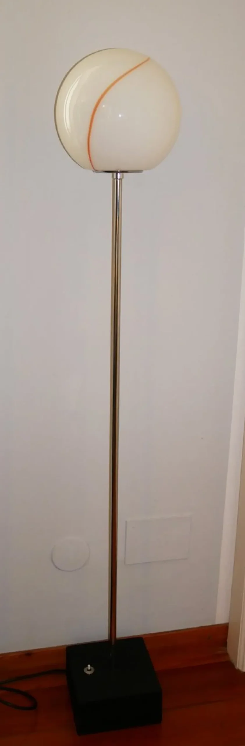 Pair of lamps with chromed metal stems, black lacquered cast iron base and decorated white Murano glass spheres.