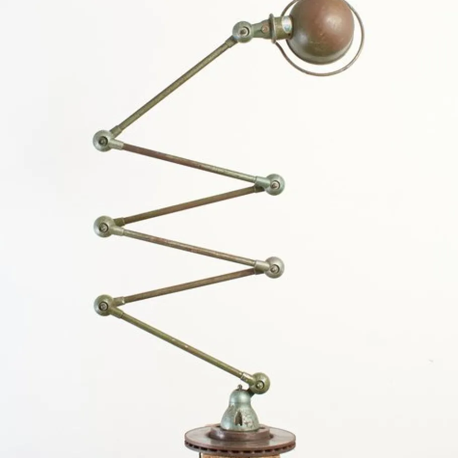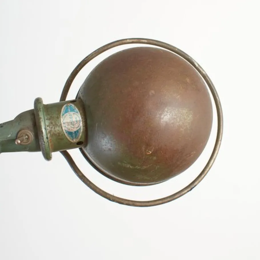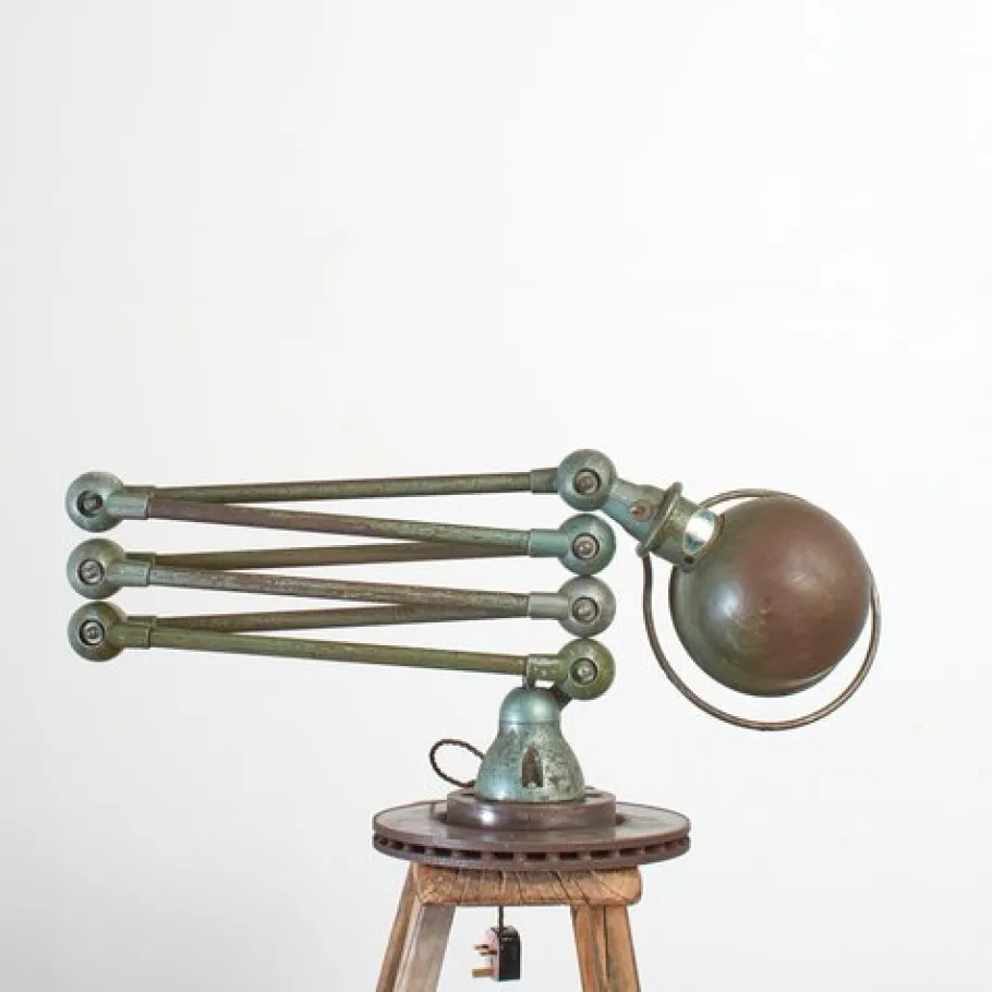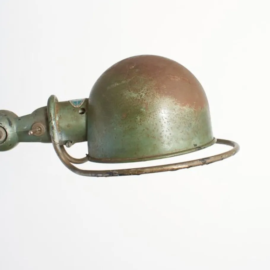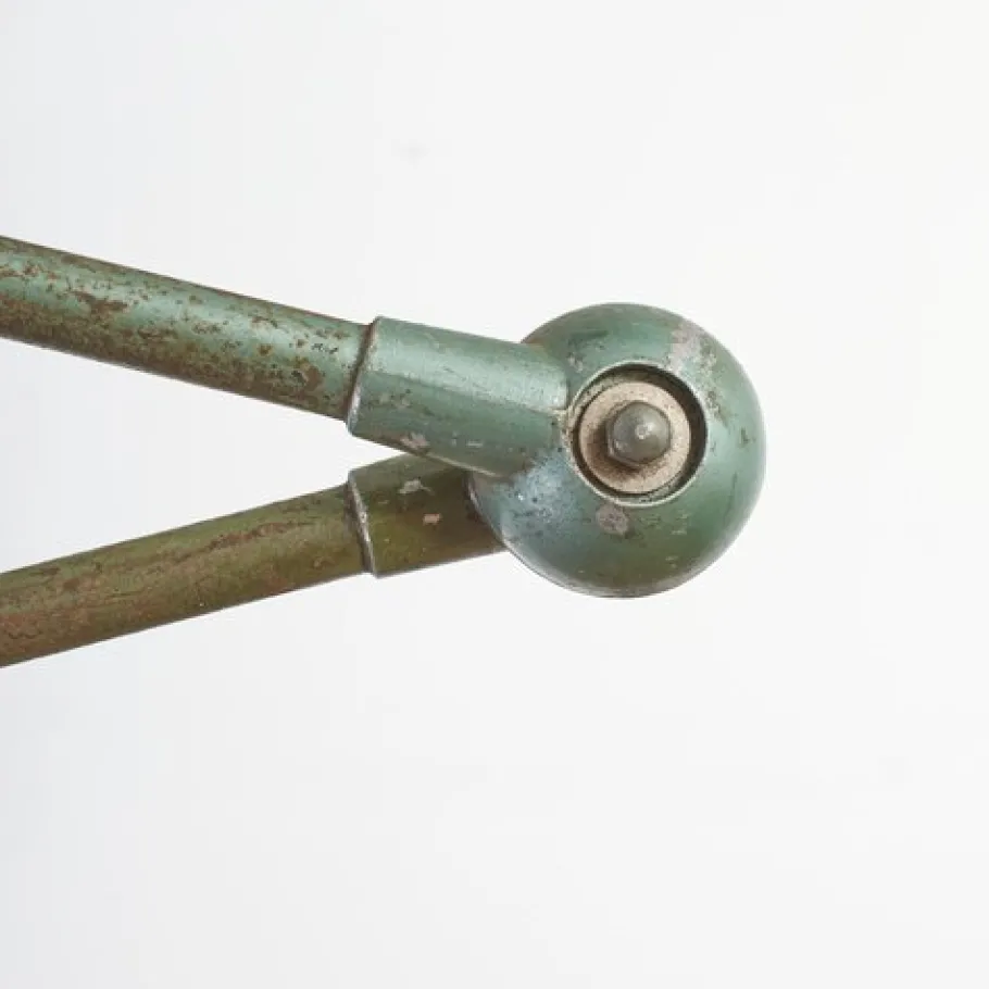 Dimensions: Each arm 40cm Shade dia 16cm Base dia 30cm Origin: France. Circa: 1950s Workshop Report: The workshop team inspect all products and perform any necessary repairs to ensure many more years of future use, the lamp metalwork has been cleaned waxed and existing bulb holder has replaced with a new CE certified E27 (screw) bulb holder and it has been rewired with 2.5m of brown twisted vintage style fabric flex and a 3 pin UK plug. The metalwork is clean with a original green aged patina, the internal lampshade retains its original white paint and shows signs of wear.