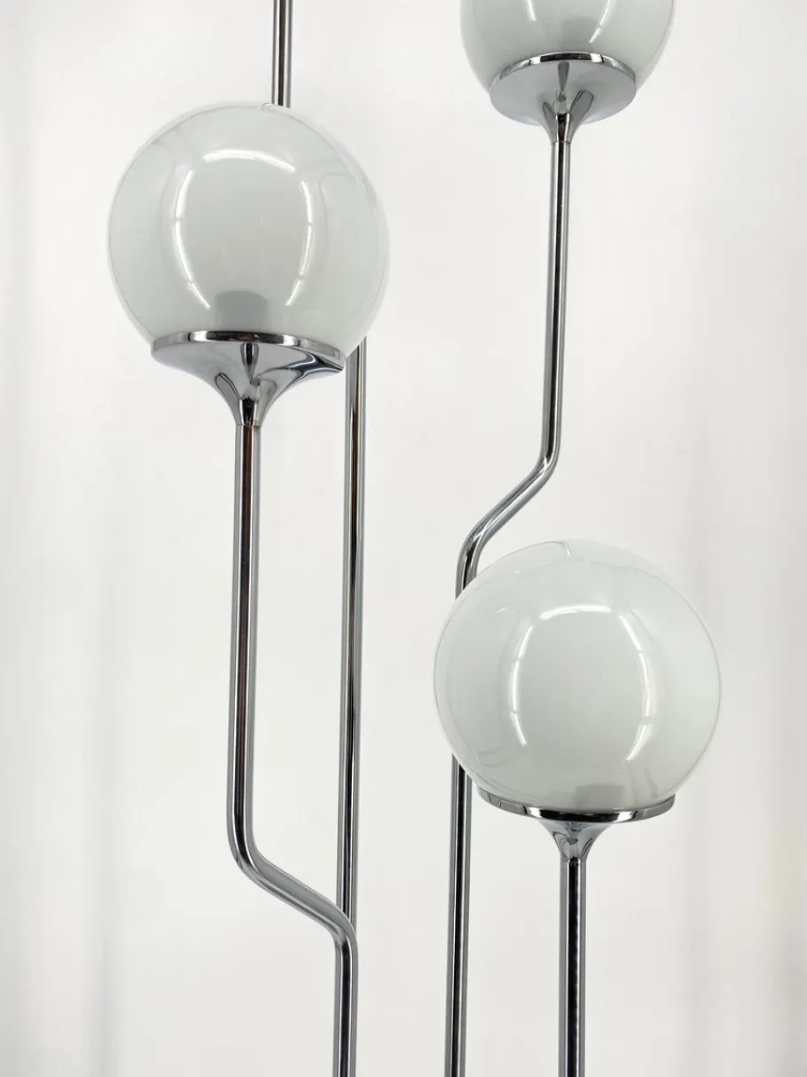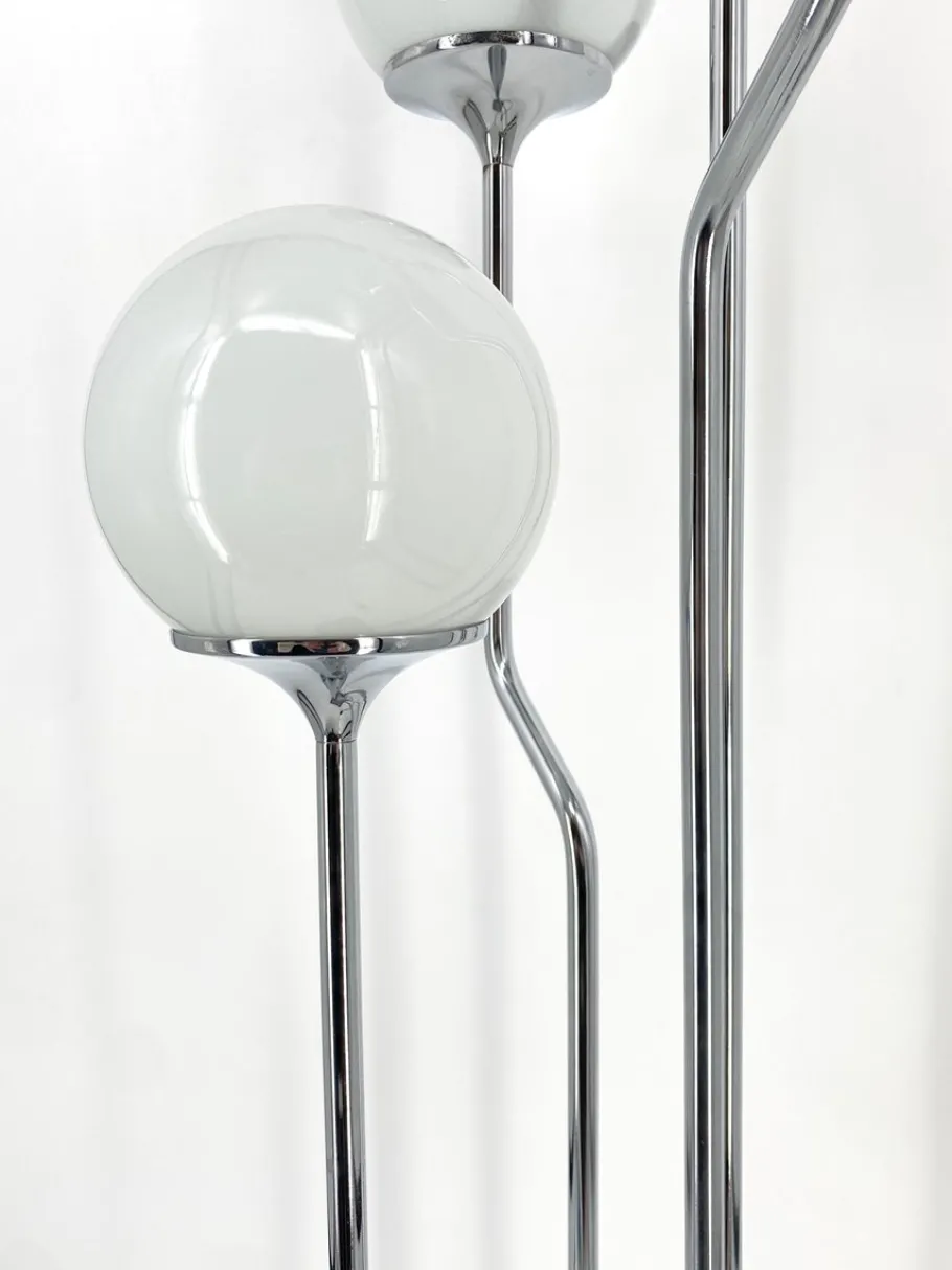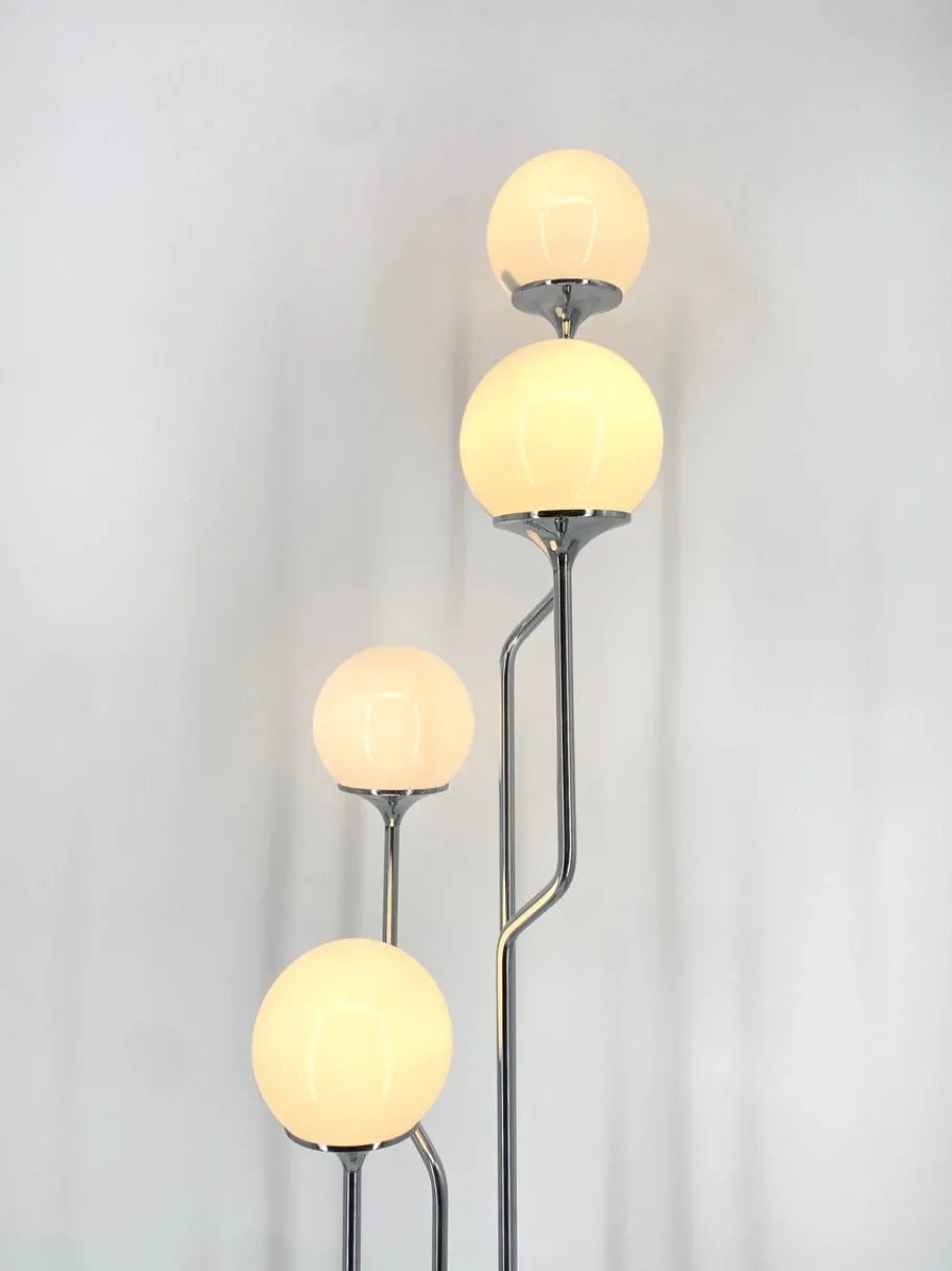 * Four opal glass balls on narrow, graphically curved chrome rods