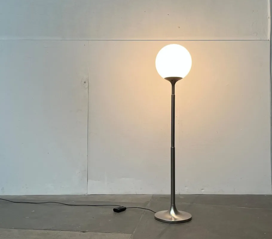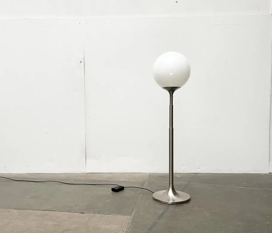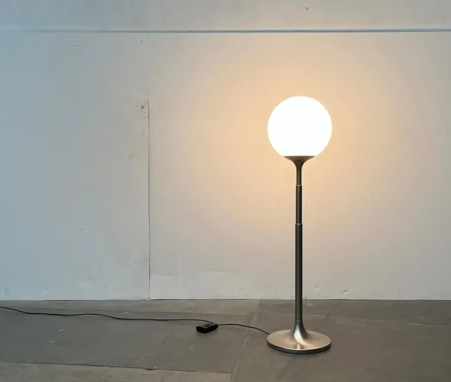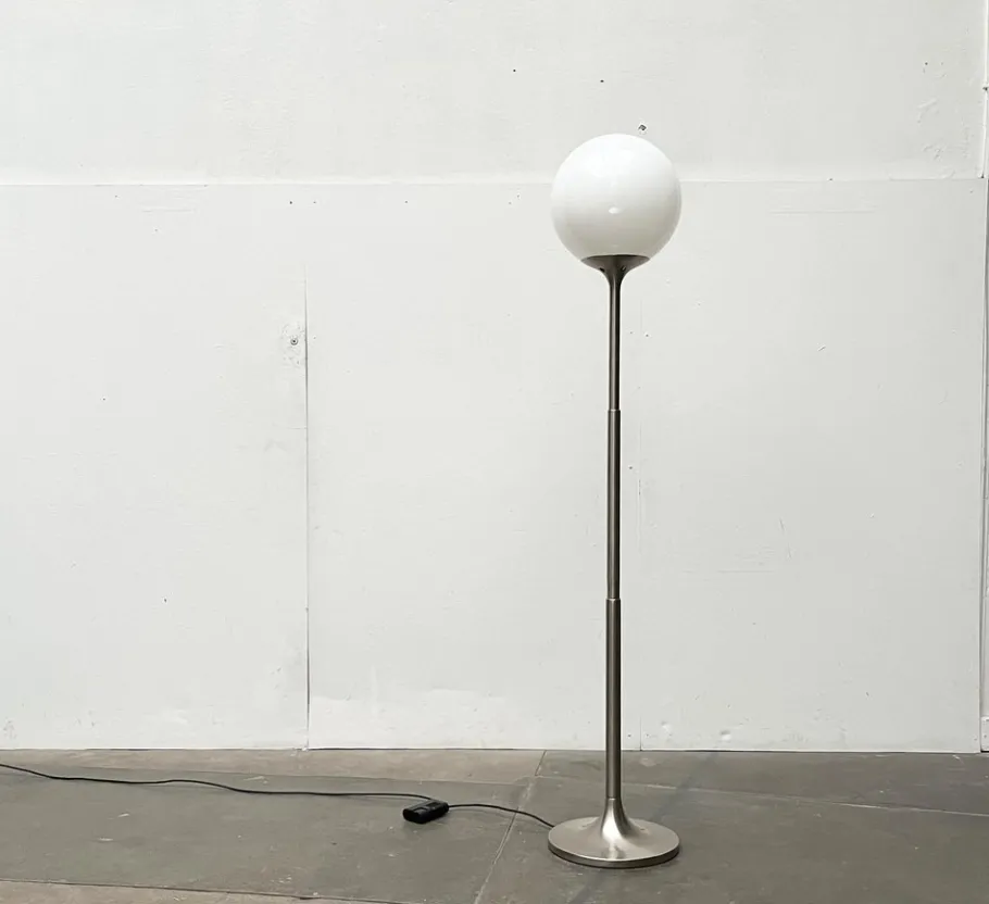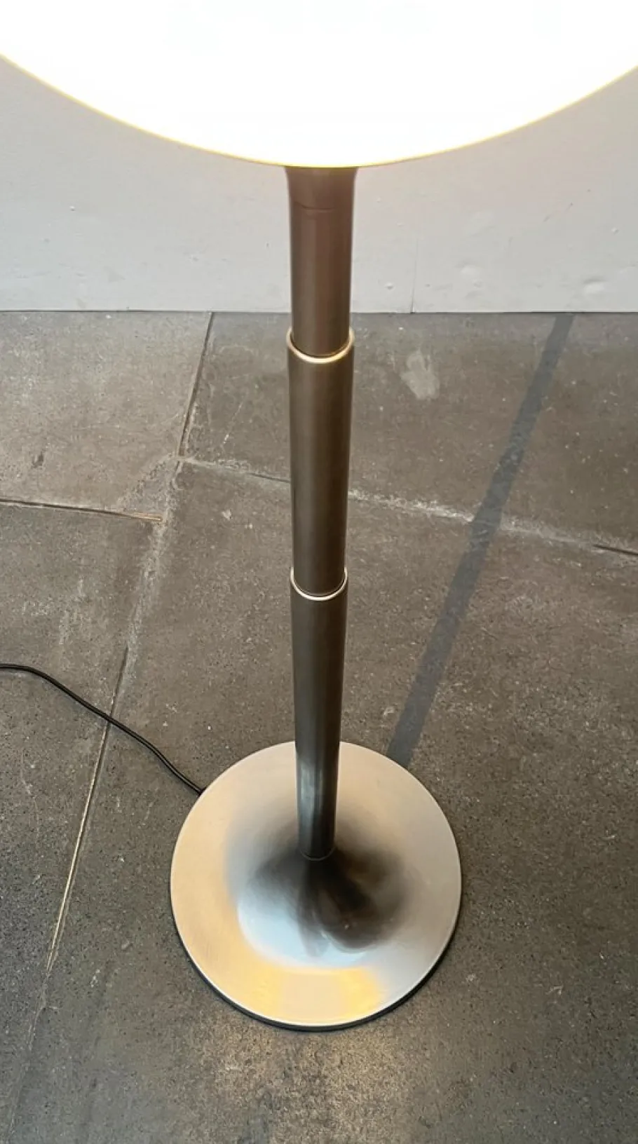 A classic design with technical design language in the details. The special feature is the changing proportions of this simple floor lamp. The diffuser is an opal glass sphere that sits on a metal base. The upper end of the shaft echoes the curve of the sphere and forms a flowing transition from metal to glass. The sphere is fixed inside with a clip. A special detail can be found in the design of the shaft. This has a telescopic design that allows the height of the light to be adjusted continuously. The lower end of the shaft is shaped like a trumpet and forms the base.