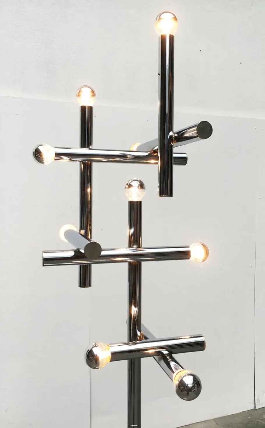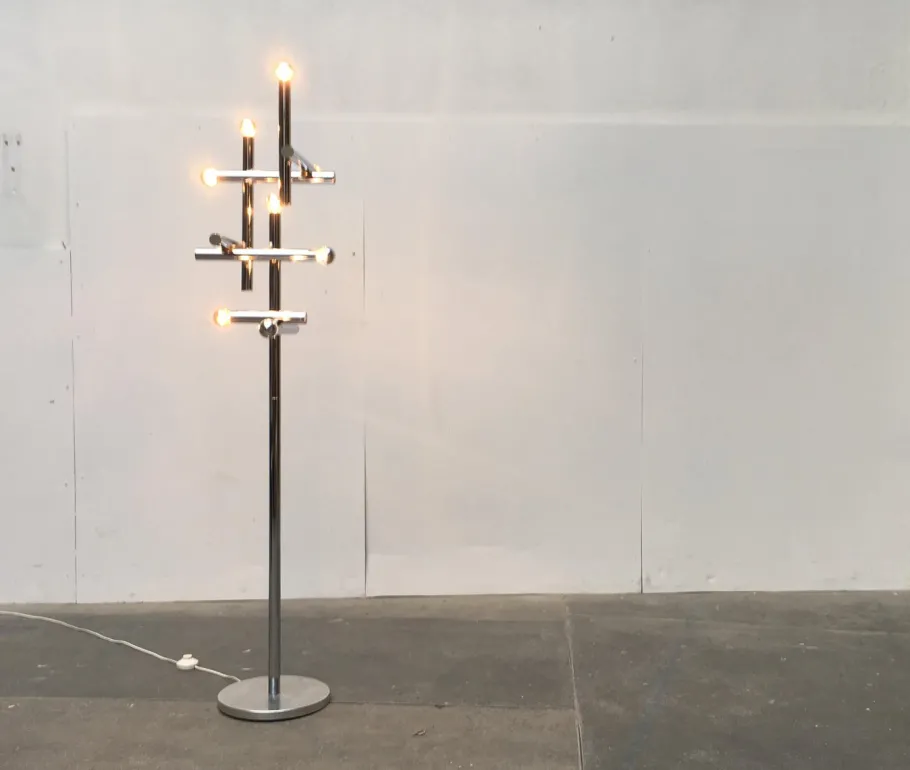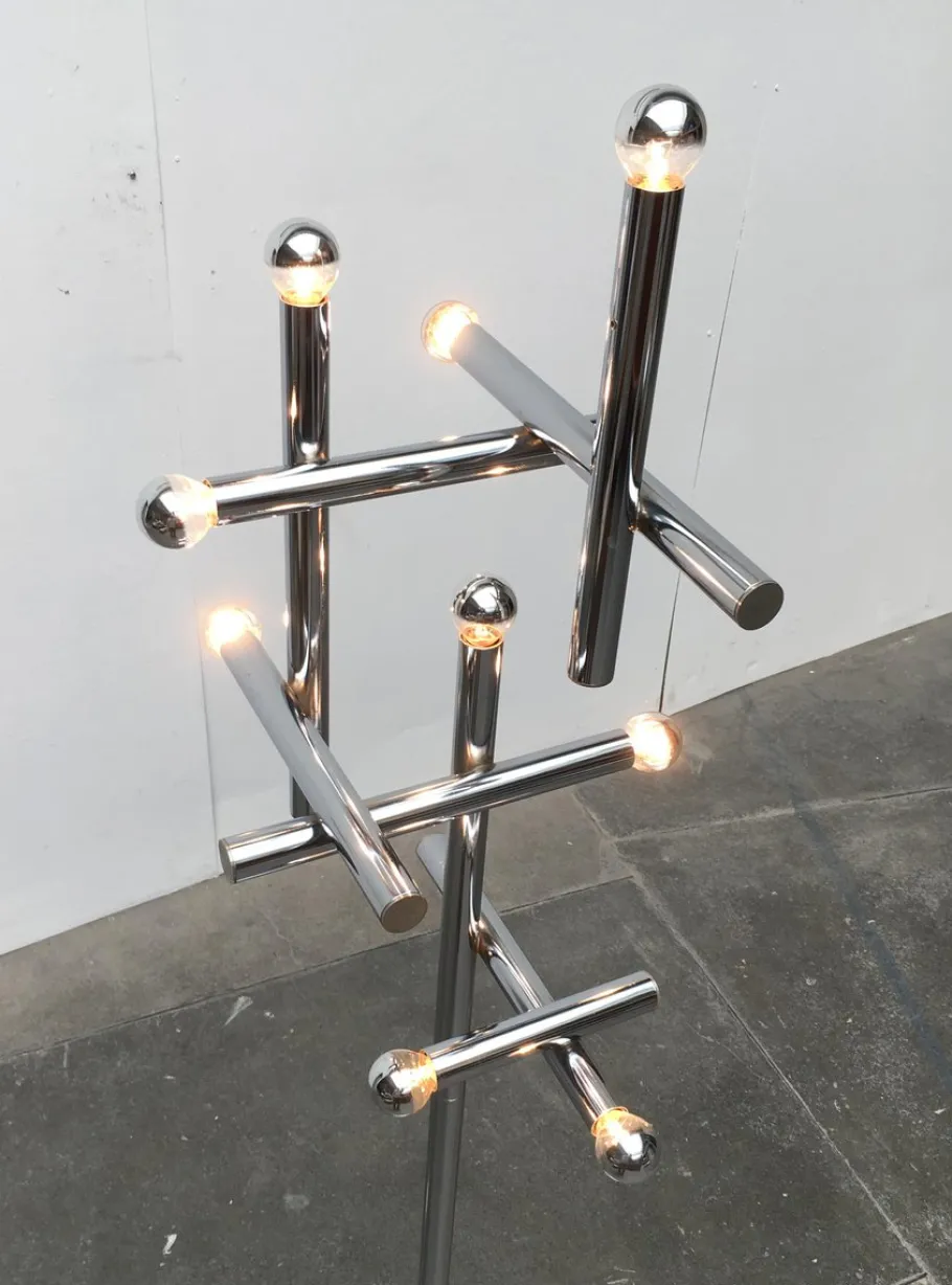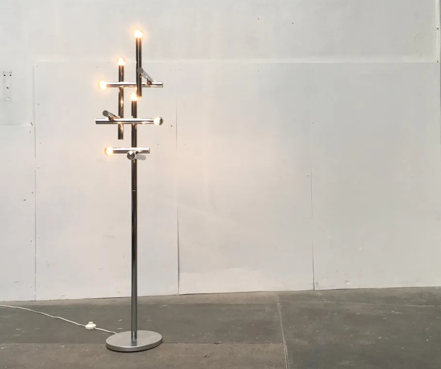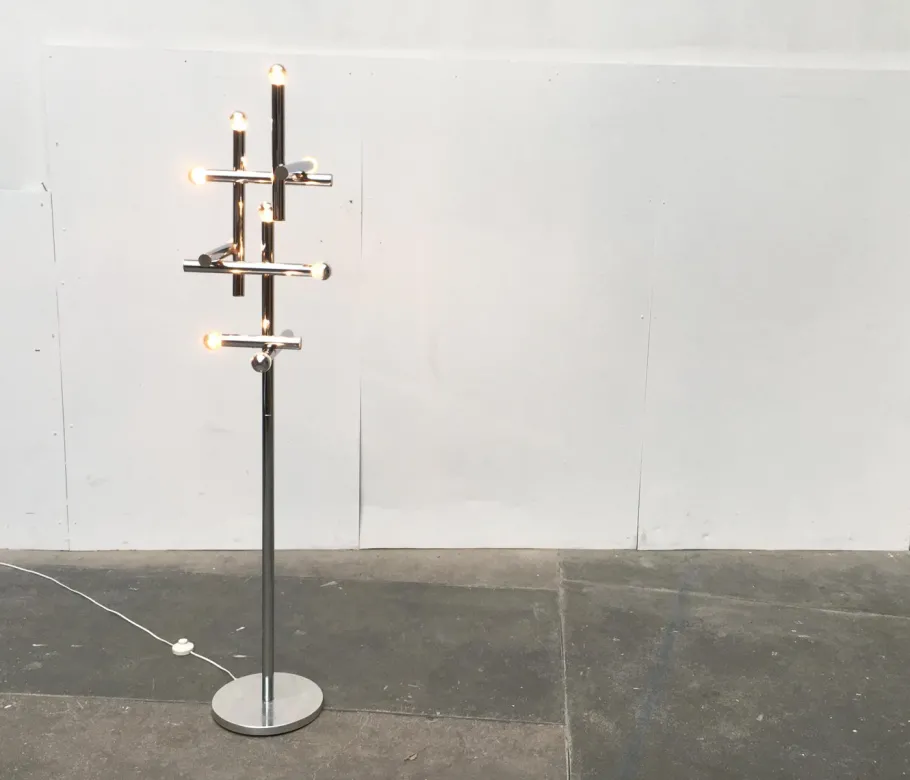 A truly imposing floor lamp. A functional light source and striking light object in the room. The actual lamp head is a kind of light structure. It consists of an addition of 9 chrome-colored cylinders, at one end of each of which sits a socket. The cylinders are arranged horizontally and vertically and connected strictly at right angles.