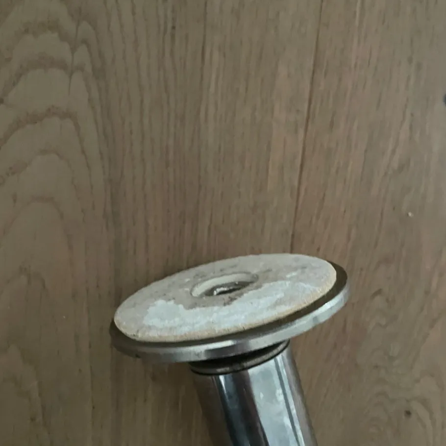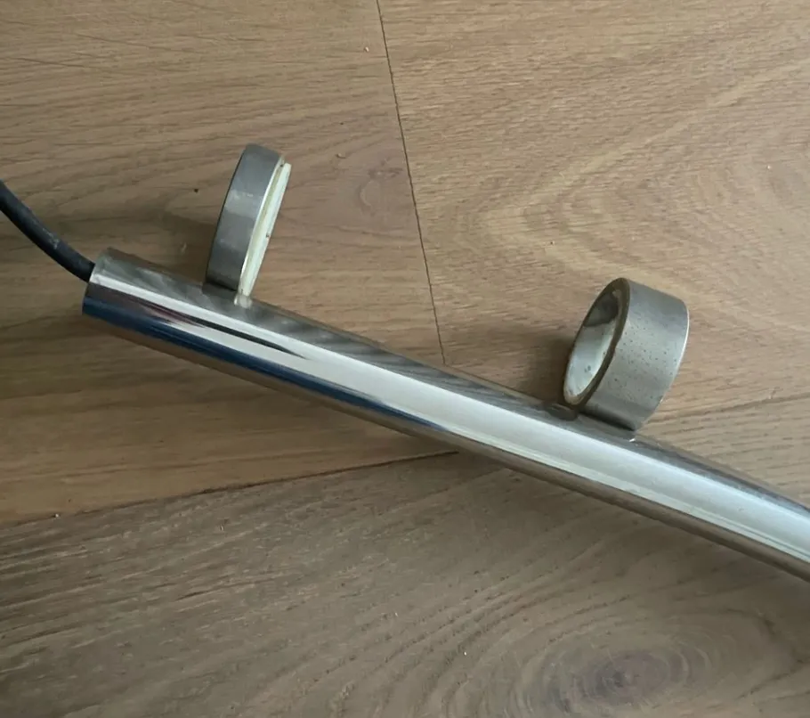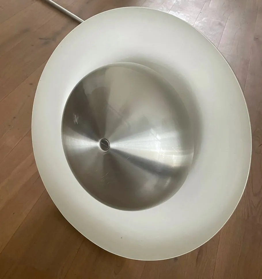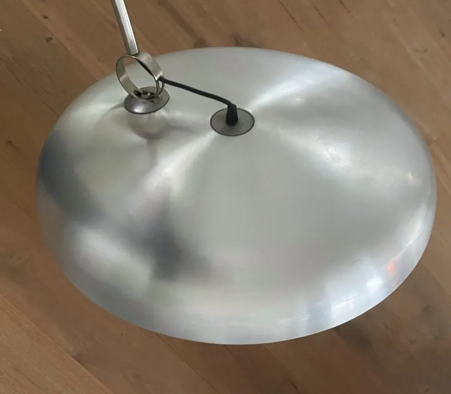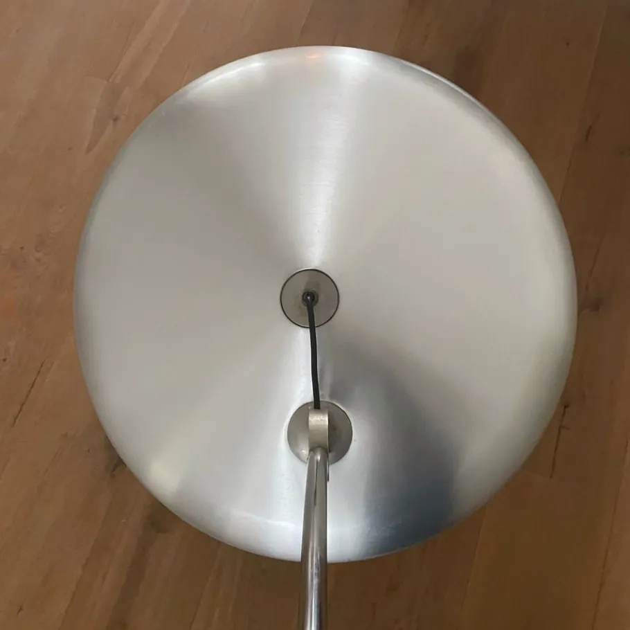 Made of brushed steel, with aluminum diffuser adjustable in height. The tall arm of the piece is made of chrome-plated tubular metal.