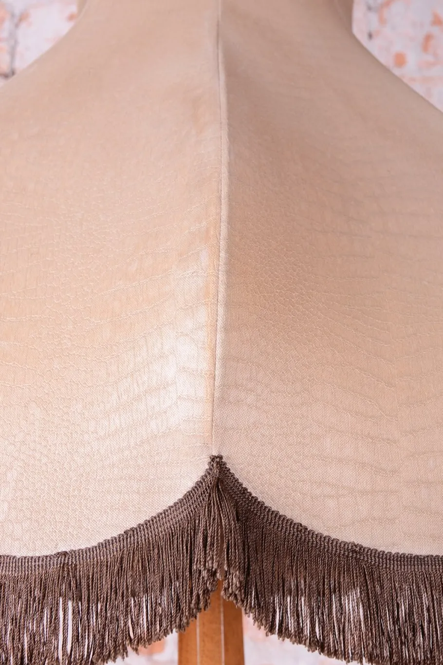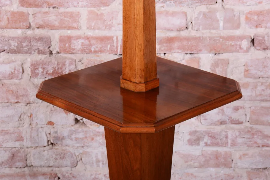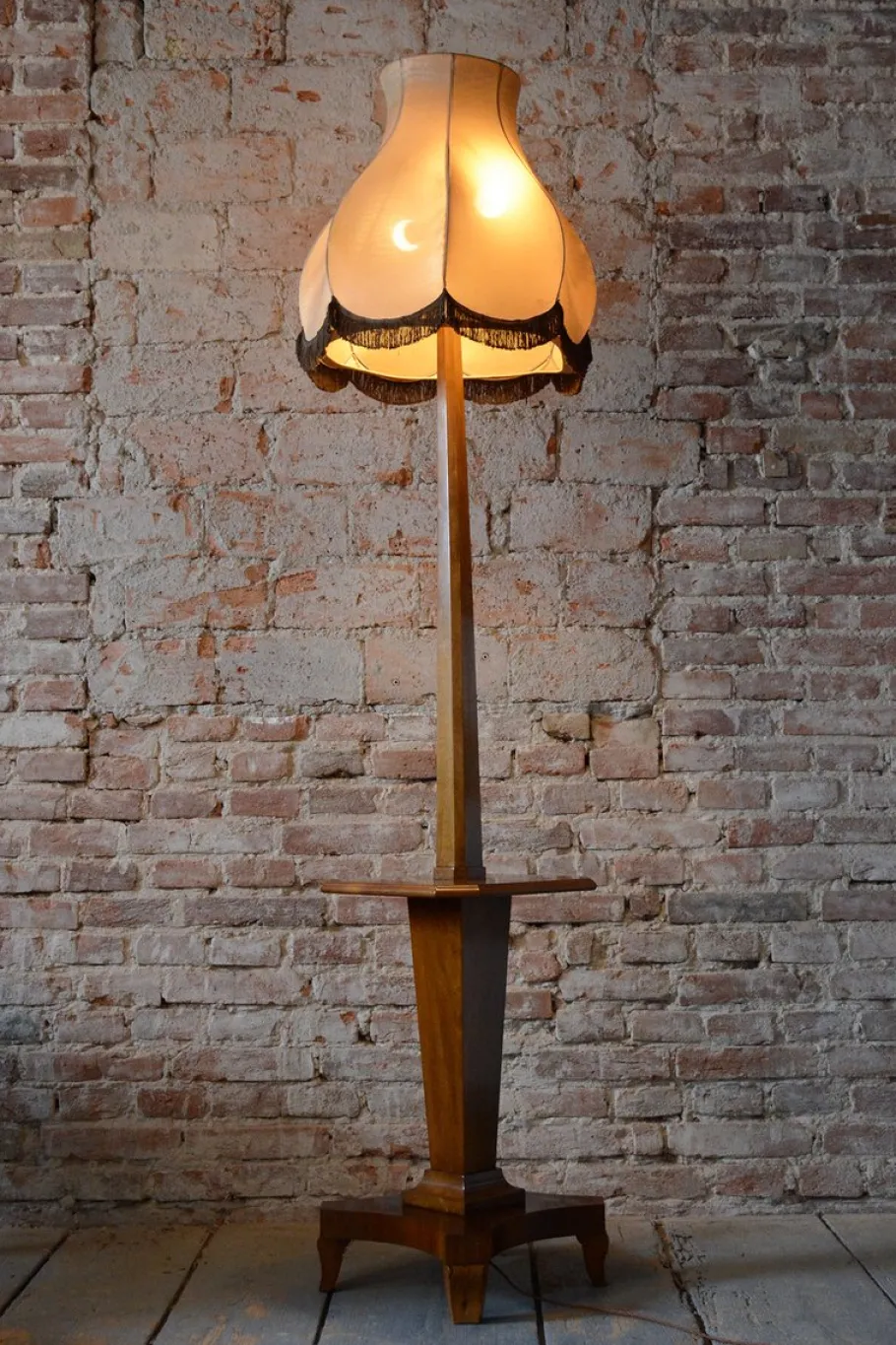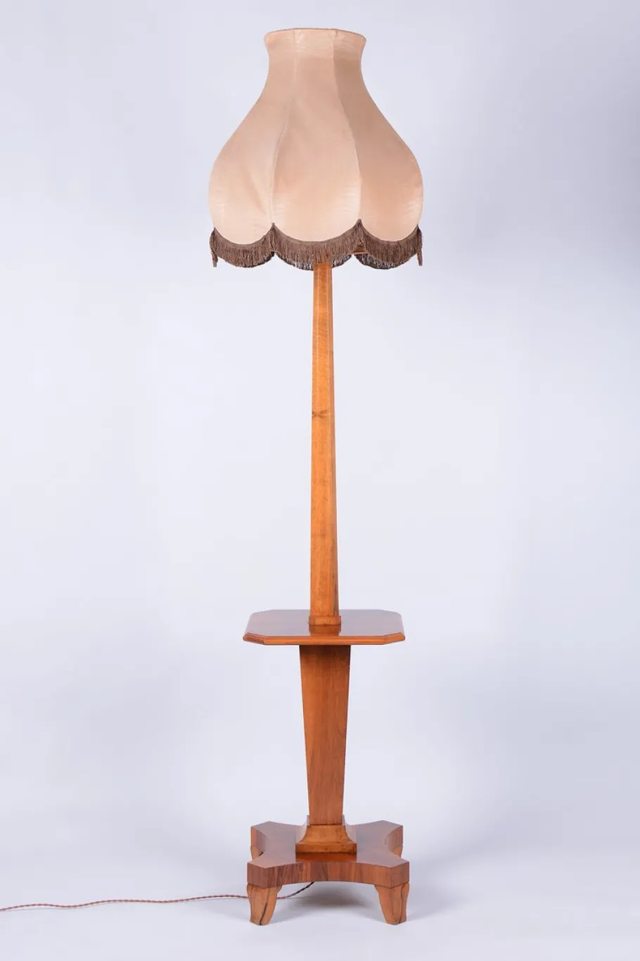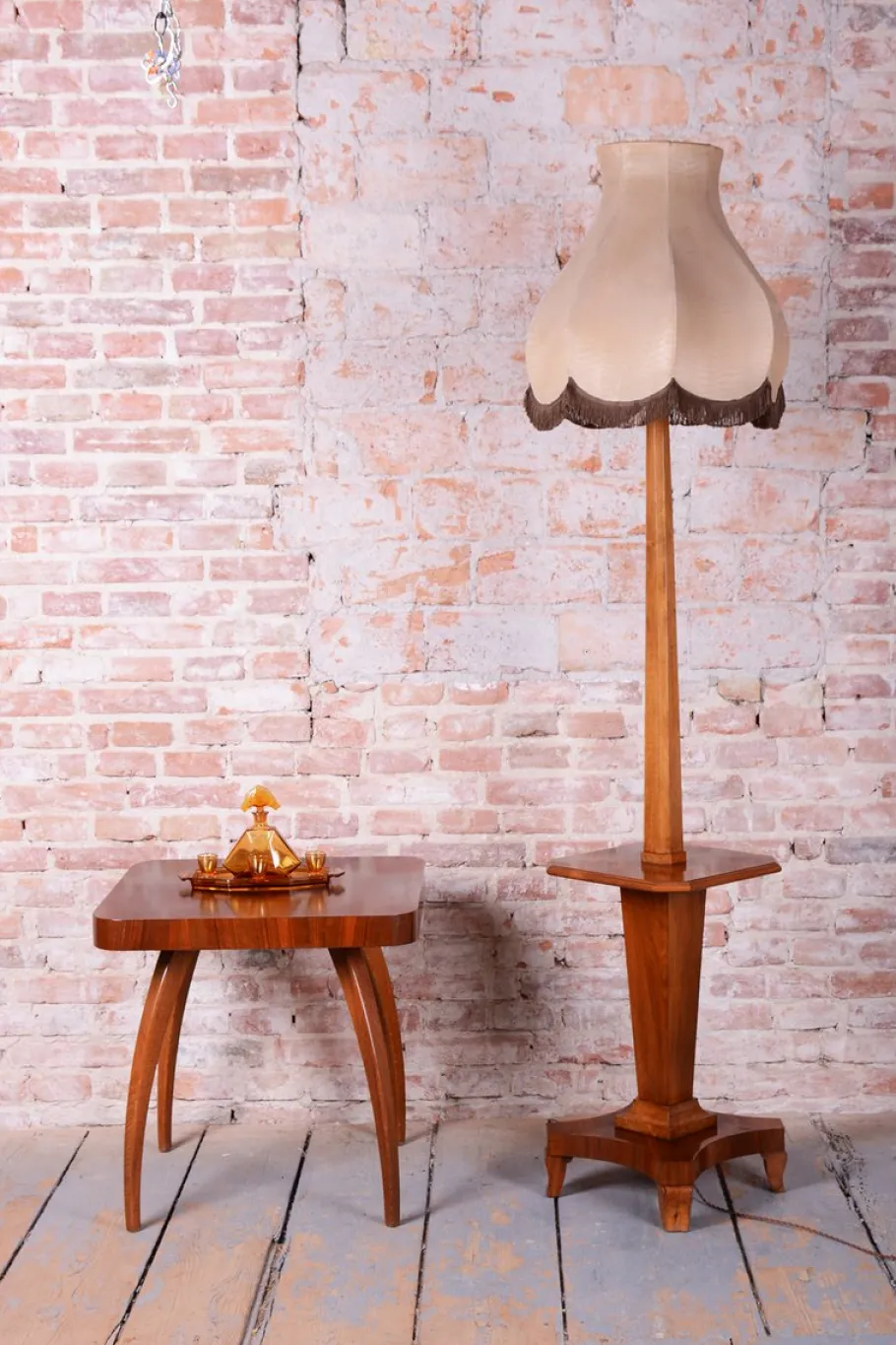 The lamp has undergone meticulous restoration, during which its original polish has been revived, highlighting its authenticity. It is fitted with a textile lampshade that complements the overall aesthetic and provides pleasant illumination. For safe and reliable use, it has been newly electrified.