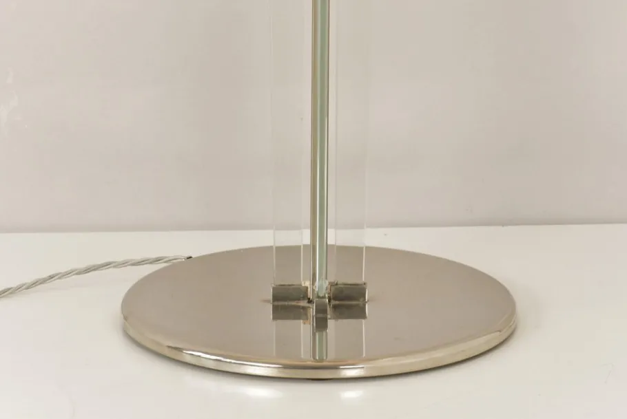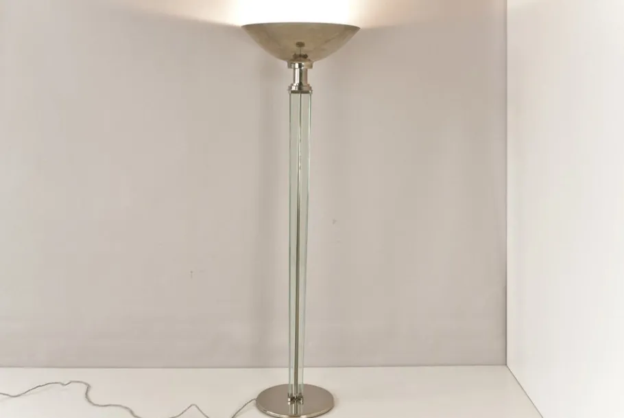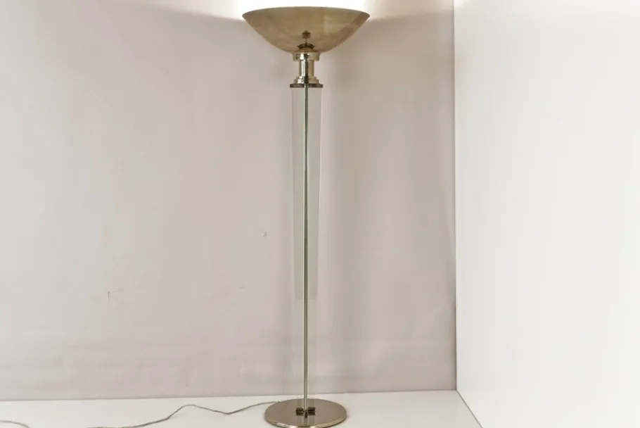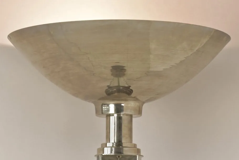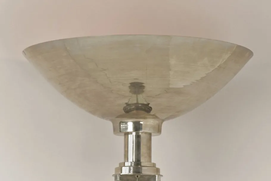 Fine materials and good workmanship can be found in the decorative ART DECO floor lamp from France. Apparently manufactured in a small series, not many of these lights have survived the last 70 years. In the living room or entrance hall, the luminaire always sets a high-quality (light) accent. with the included cord dimmer, different moods can be easily created and the dimmer can also be used with dimmable LED lamps.