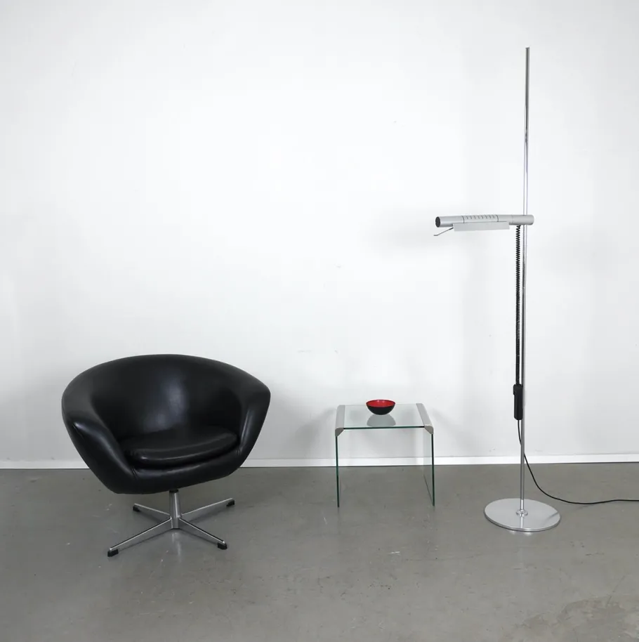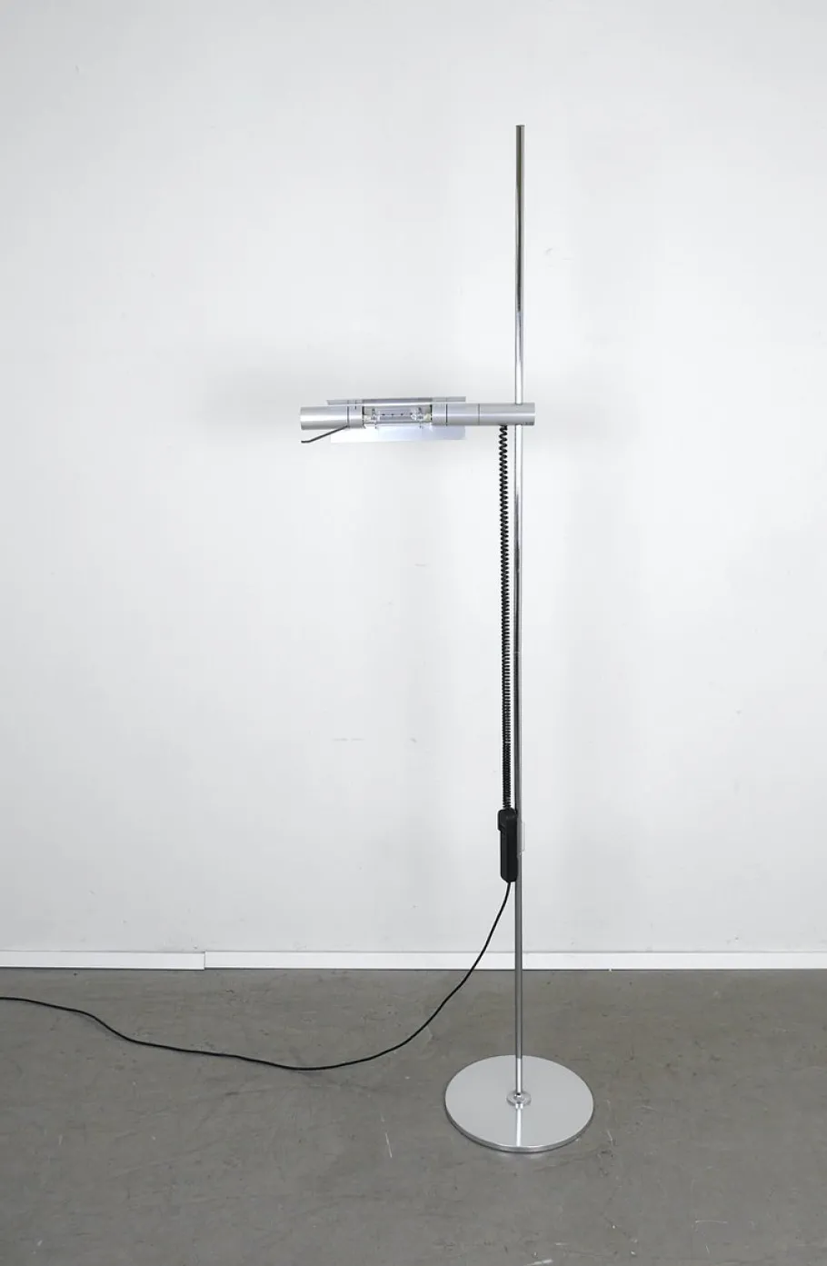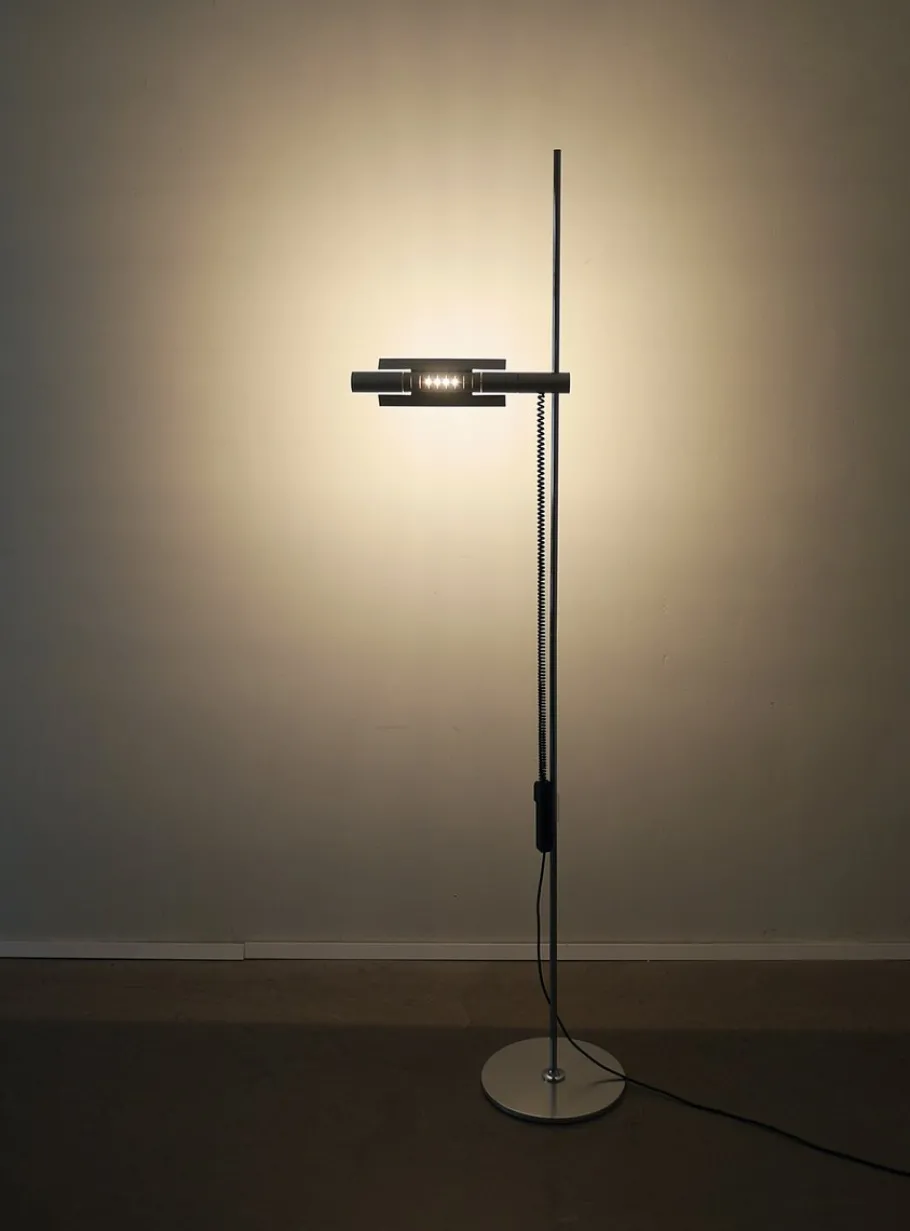 A slender, cylindrical spotlight (43 cm long) is attached to a thin, chrome-plated, 191 cm high rod. It can be rotated 360° and adjusted to any height.
