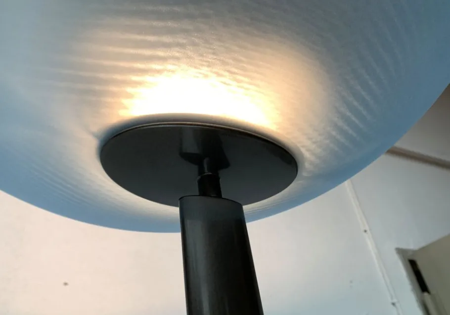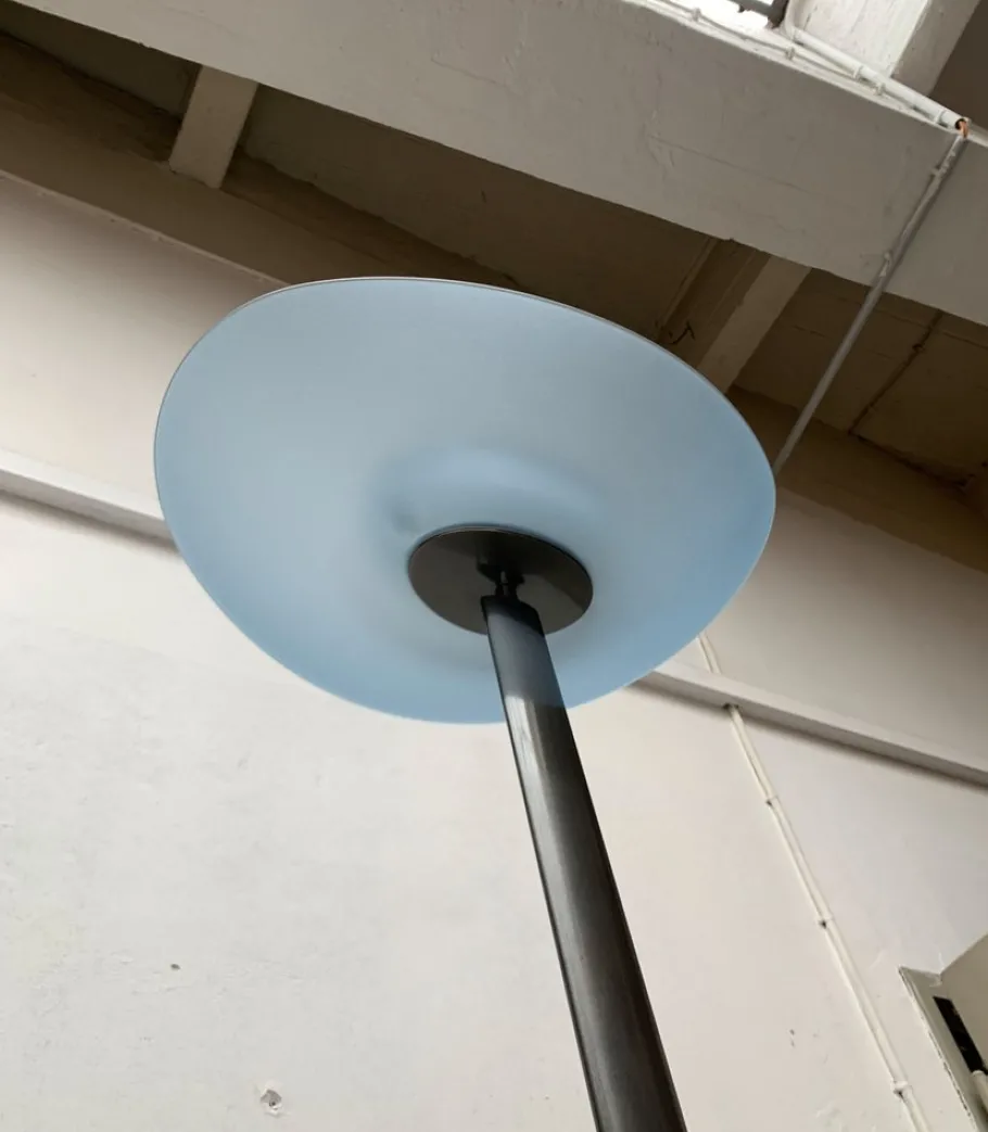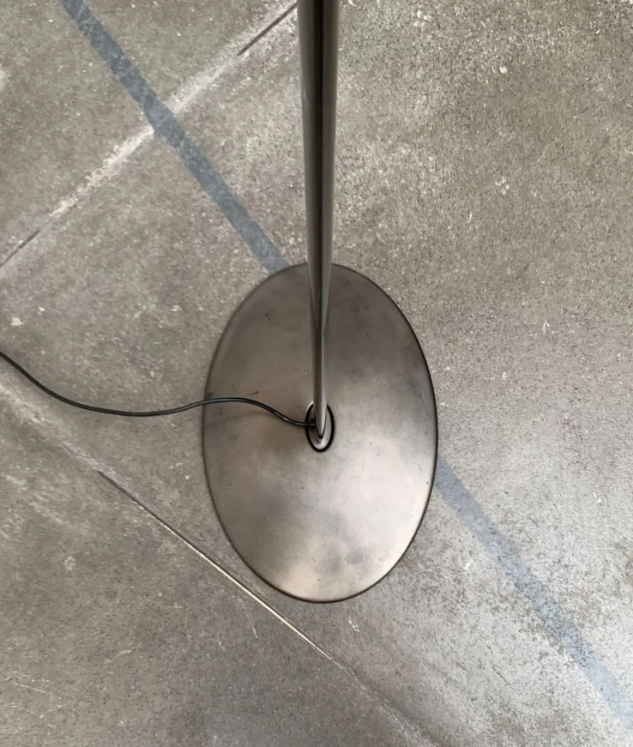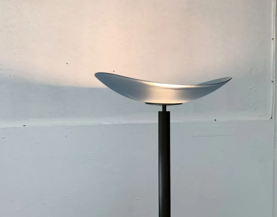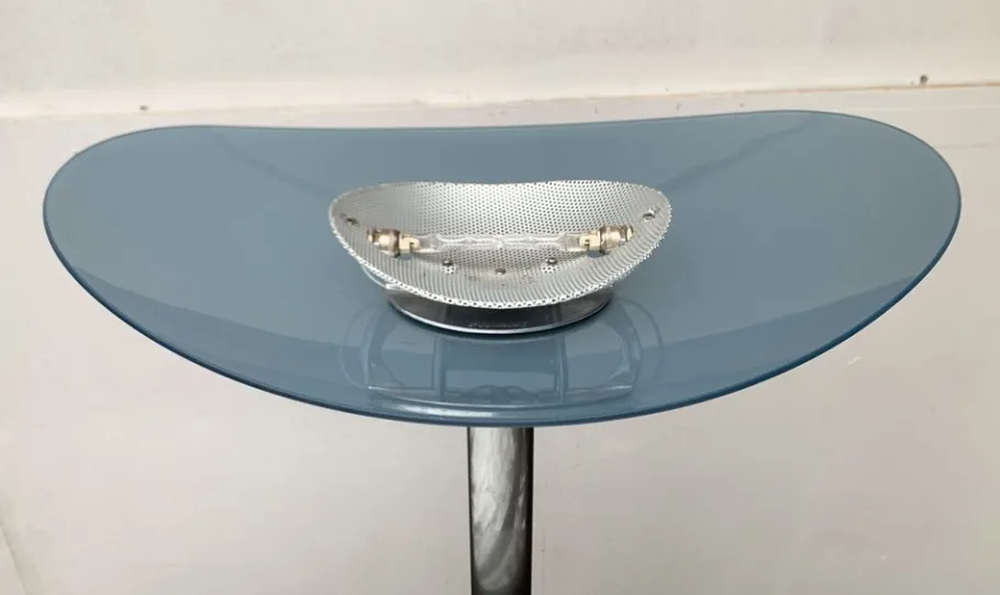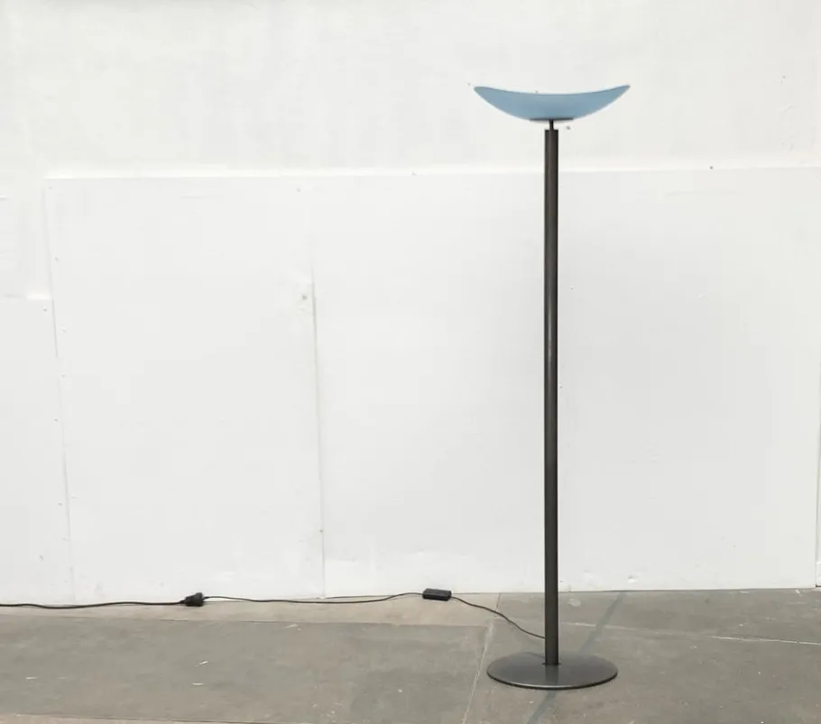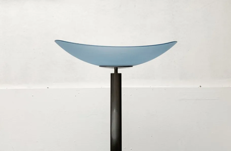 A postmodern design with special proportions. This floor lamp is a functional light source and an impressive object at the same time. An elegantly curved bowl made of satin, blue glass serves as a diffuser. The colored shell sits at the end of a long shaft. The shaft is kept in a dark shades of gray and lentil -shaped. The transition of the shaft to the oval plate foot takes place via an elegant joint.