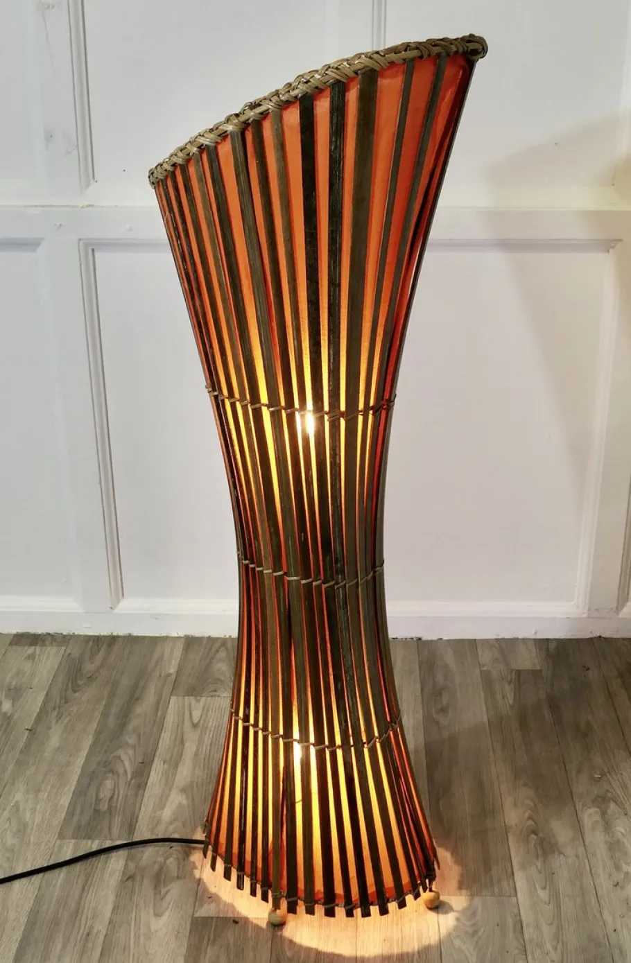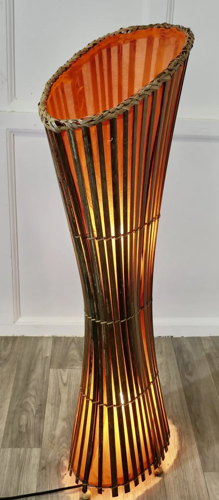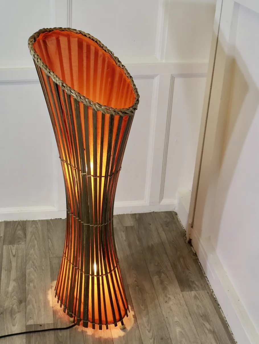 The Lamp is set in an iron frame with a waisted shape made with split bamboo cane and lined in vivid orange fabric, the lamp is in working condition