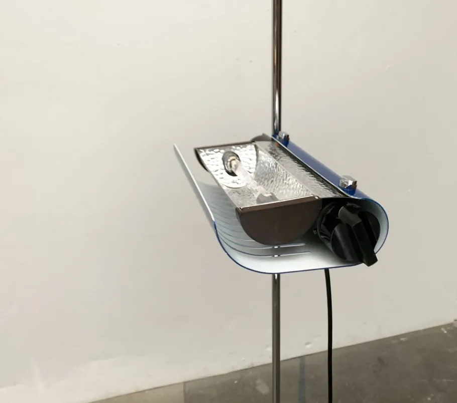 The name of the luminaire makes direct reference to her unique designer: Joe Colombo. The proportions are particularly eye -catching. A flat light head is mounted on a long chrome rod and can be moved on and down. In addition, it can be tilted and rotated. It is fixed via a rotating plastic button with a handle. The height of the luminaire of just over 2m is also special, which makes it appear quite impressive despite the filigree design. A rotating dimmer is integrated in the head, which reflects exactly the shape of the grip of the height adjustment.