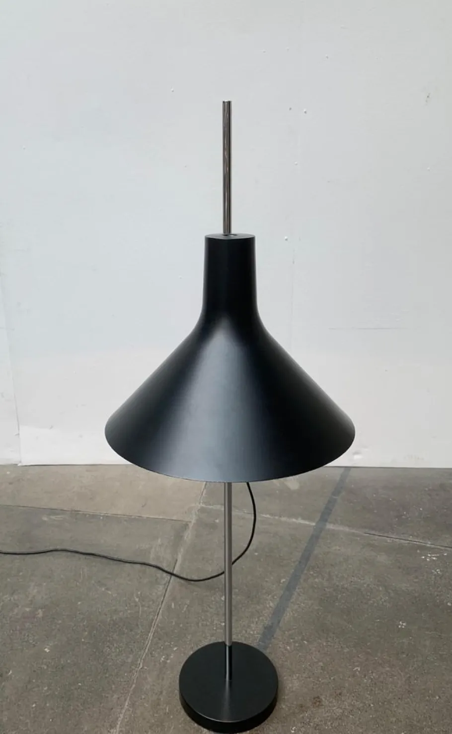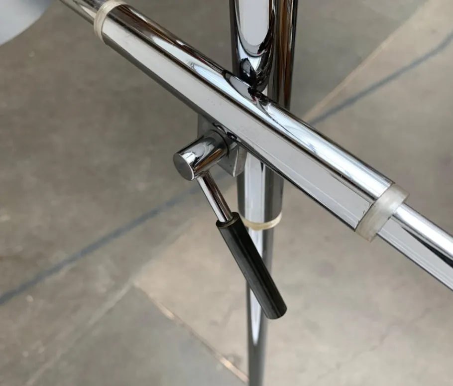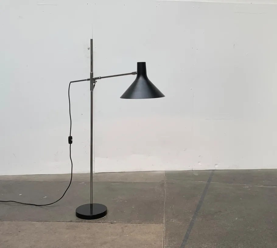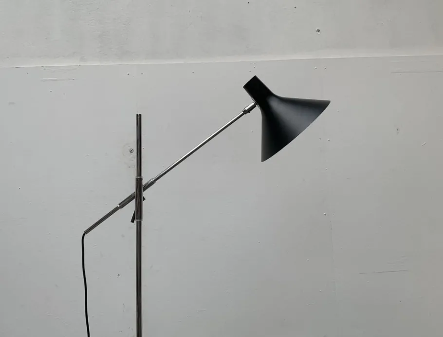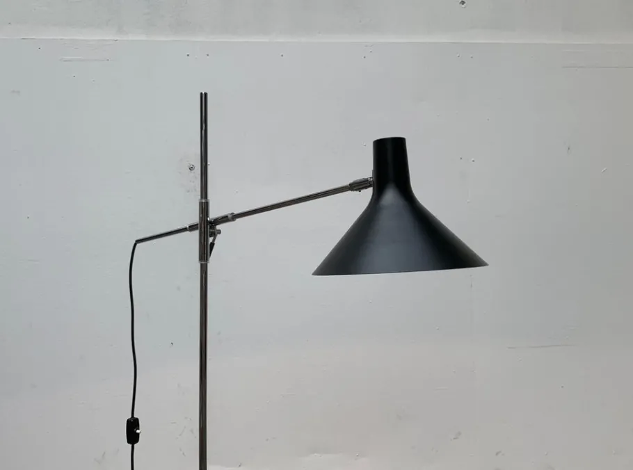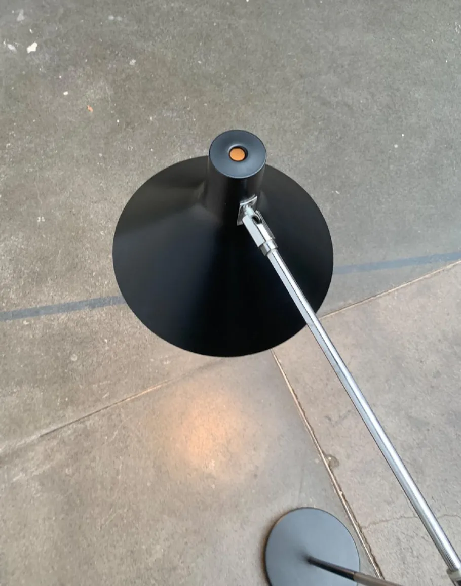 A simple design in a minimalist design language. The screen has a classic shape and is elegantly curved. The shaft ends in a simple plate base. The special feature of this lamp is the joint, with which the arm can be aligned and adjusted in height. The joint accommodates the arm in a tube that allows it to slide back and forth. A prominent lever fixes the inclination of the arm as well as the height.