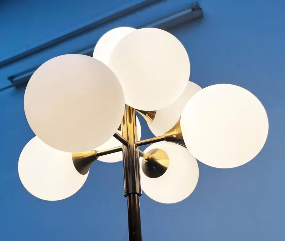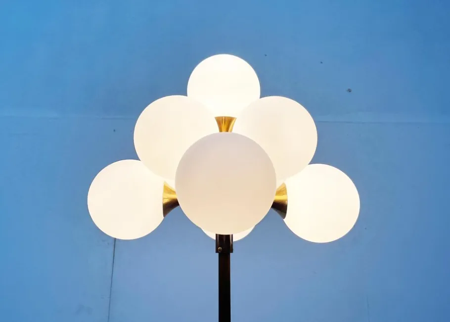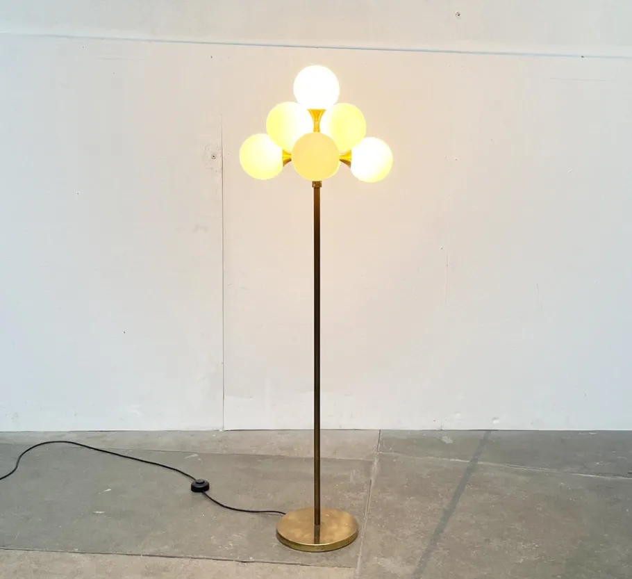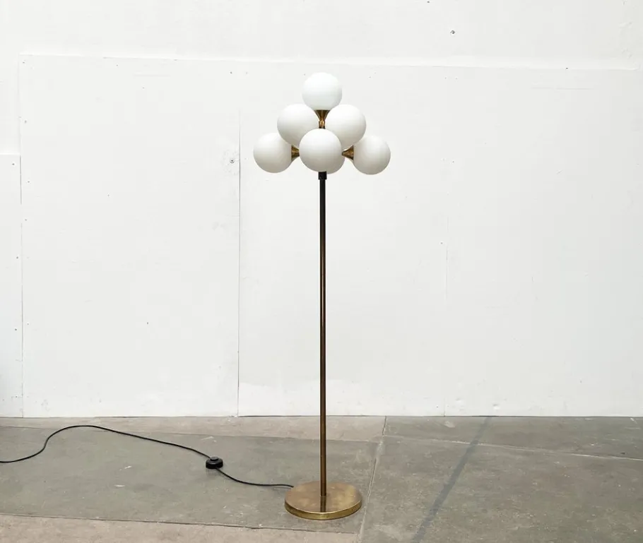 Functional light source and at the same time luminous object in the room. The grape -shaped lamp body sits at the upper end of a long shaft that ends in a simple plate foot. Opal over -the -fold glass balls serve as diffusers. The balls of the balls absorb the rounding of the glass and conclude flush. The lamp has nine versions that are equipped with E14 lamps. The manufacturer is very likely to be emperor. The lamp has a foot switch.