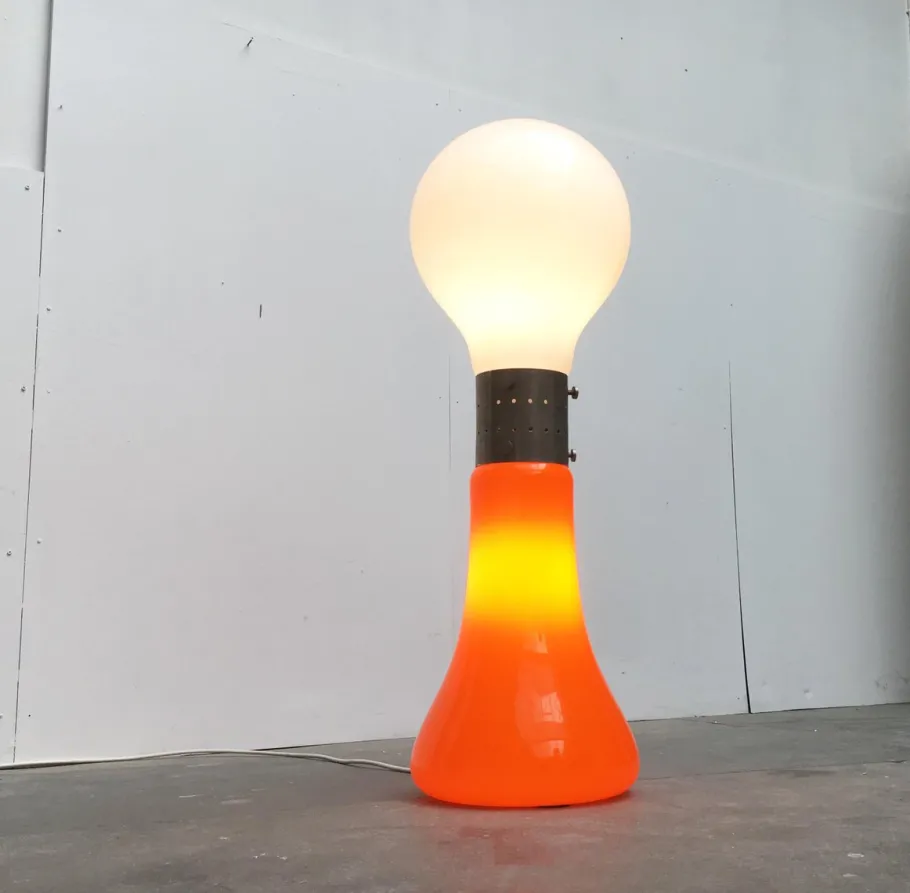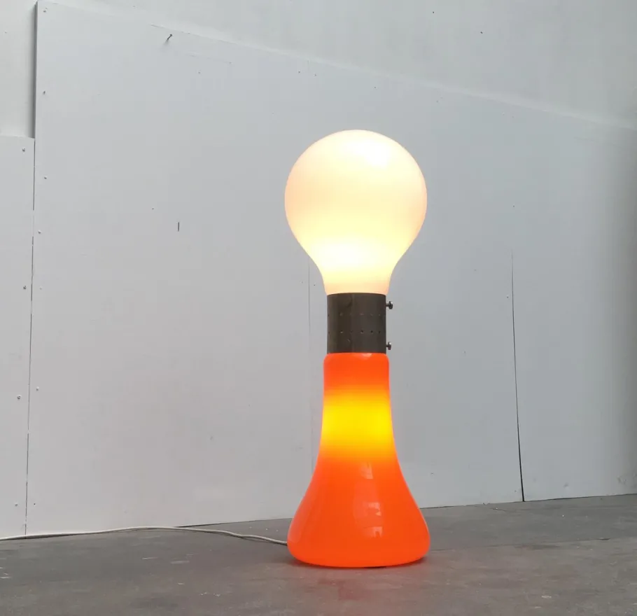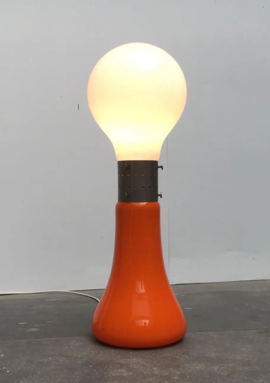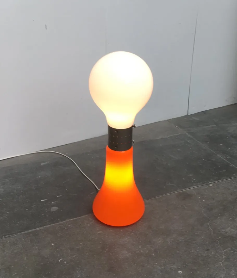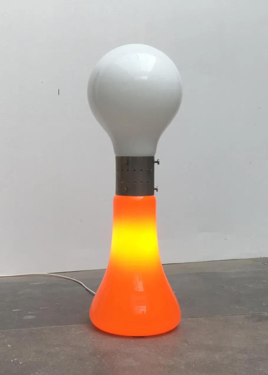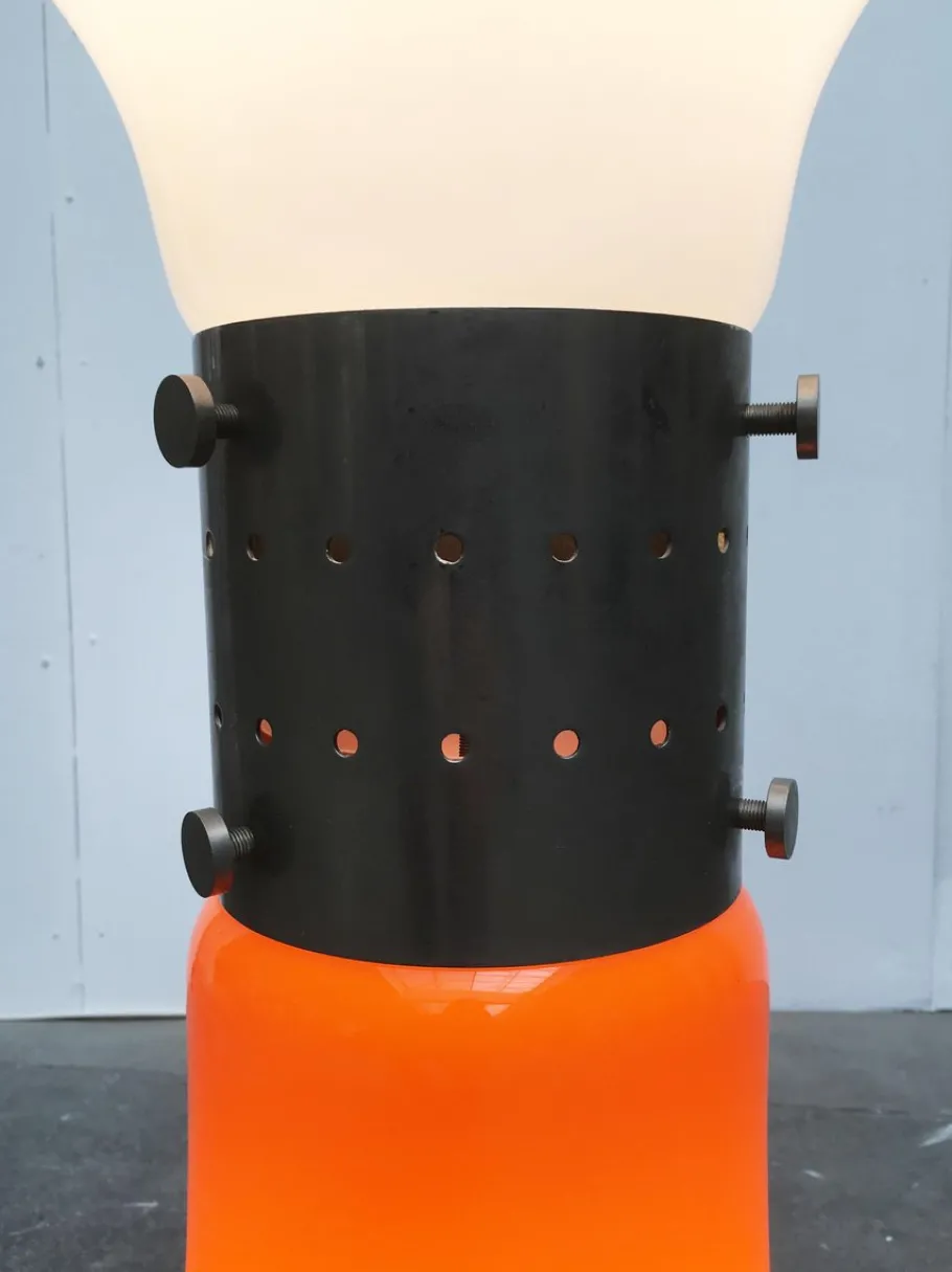 This rare lamp impresses with its materiality and organic design language. The two large diffusers, also made of opal glass, are connected in the middle with a heavy cuff and fixed with screws. The upper part is spherical, the lower part is tulip-like and forms a foot. The light highlights the shape of the lamp body and at the same time bathes the room in a special lighting atmosphere. The lamp has two burning points. One light source illuminates the upper diffuser, the second light source illuminates the lower diffuser, which also forms the base. The lamp has 2 cord switches so that the two parts of the lamp can be switched separately.