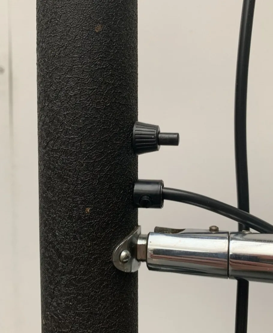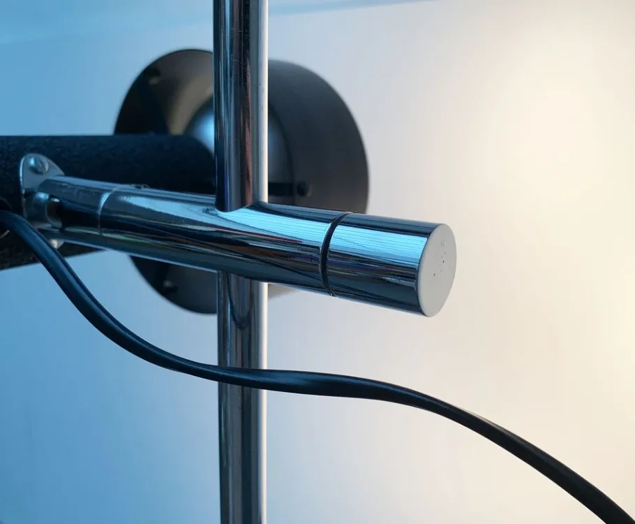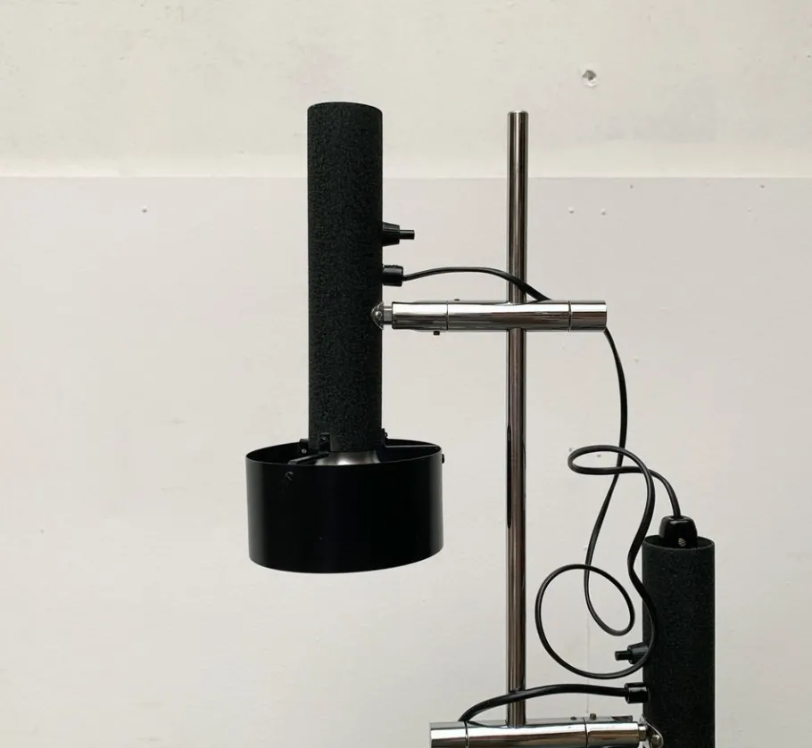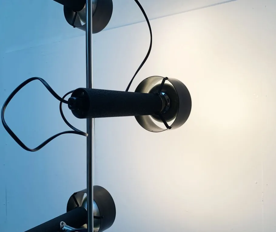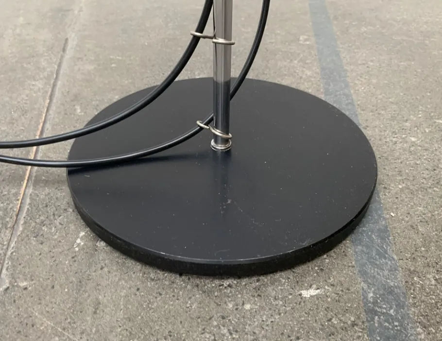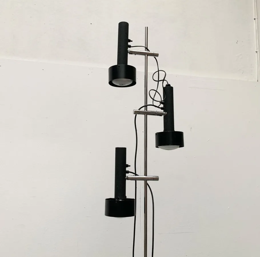 This design is ahead of his time. The reduced form language already reminds of the 60s, while he has already emerged in the mid-50s. This floor lamp pulls her elegance of precision and technical details. Especially the eye is the simple execution of the luminaire heads. A long cylinder at the front end as a screen is mounted a simple blend. The blend is connected to the shaft of the spotlight with three fine webs. The three spotlights can be freely adjusted and fixed in height. Each spot has a separate switch on the spotlight. The luminaire has two liabilities. Two spotlights are put together. To do this, each steel head has a socket as a special feature on the back to switch the radiators in series.