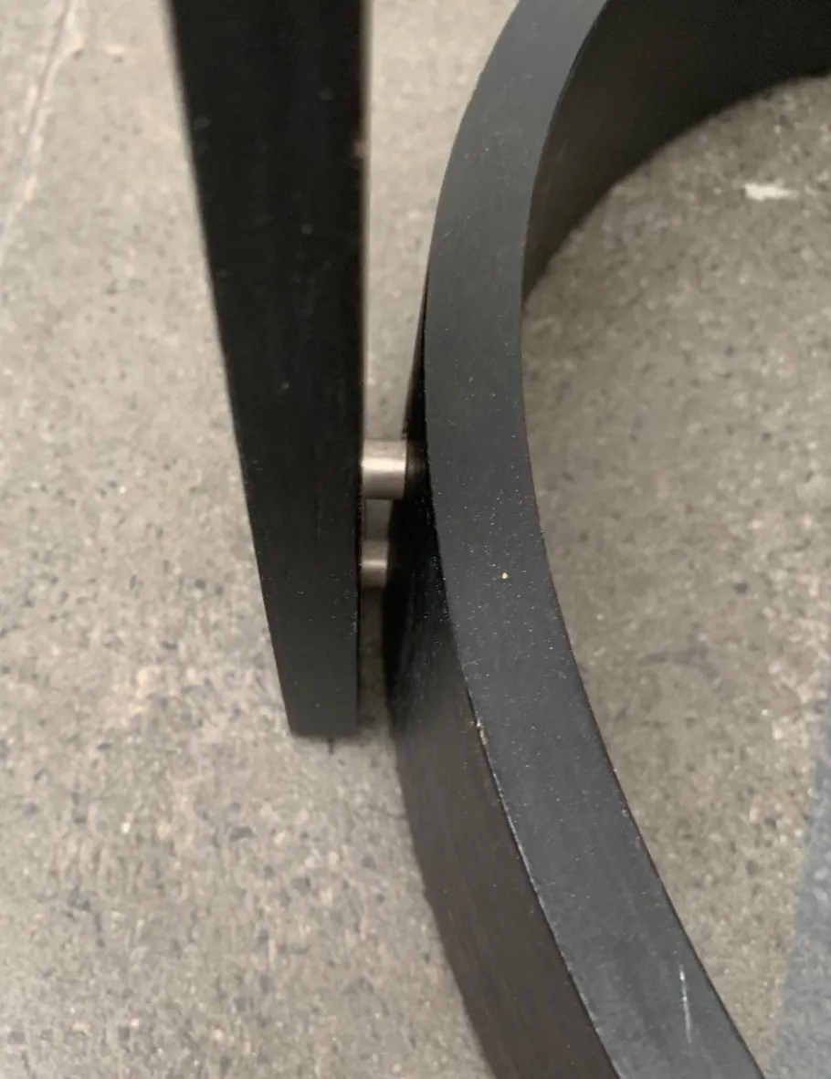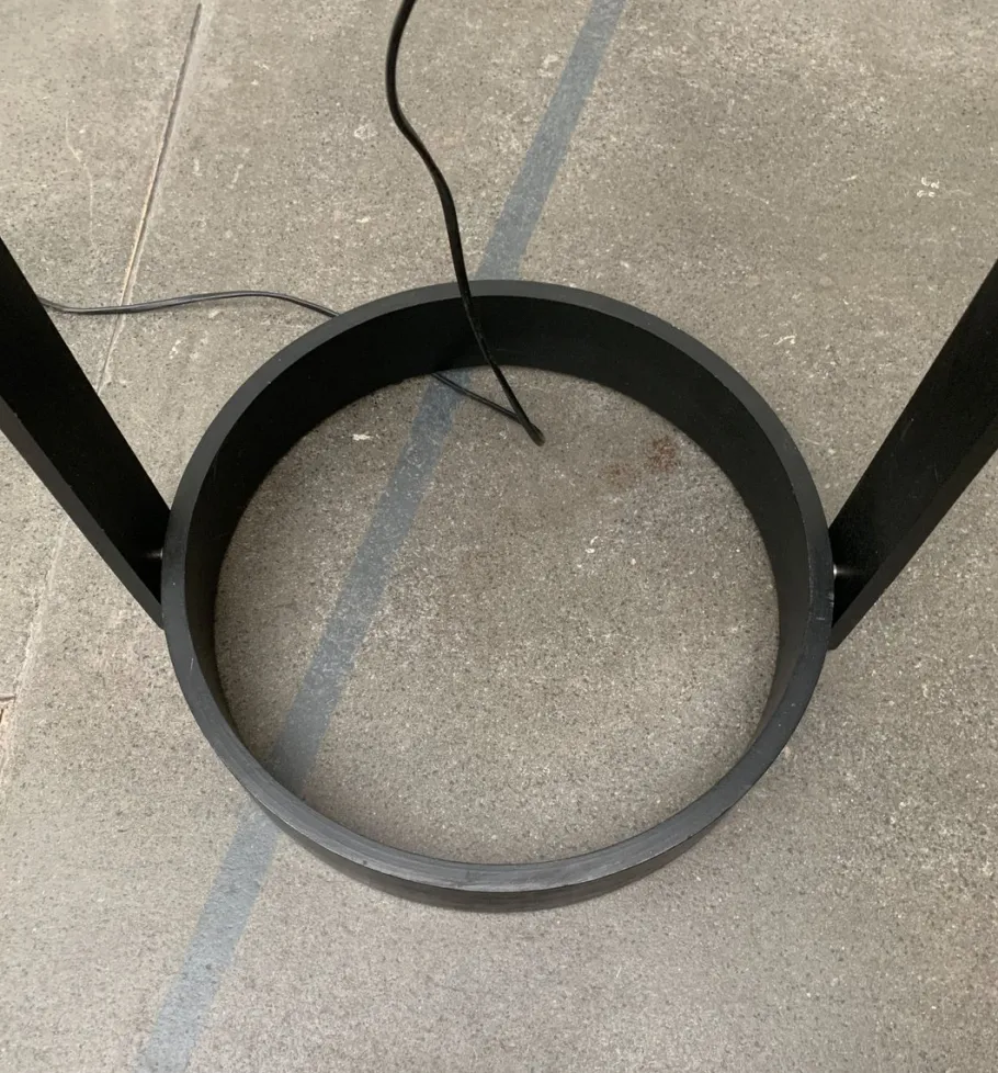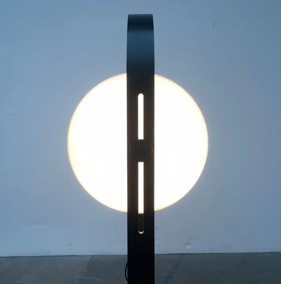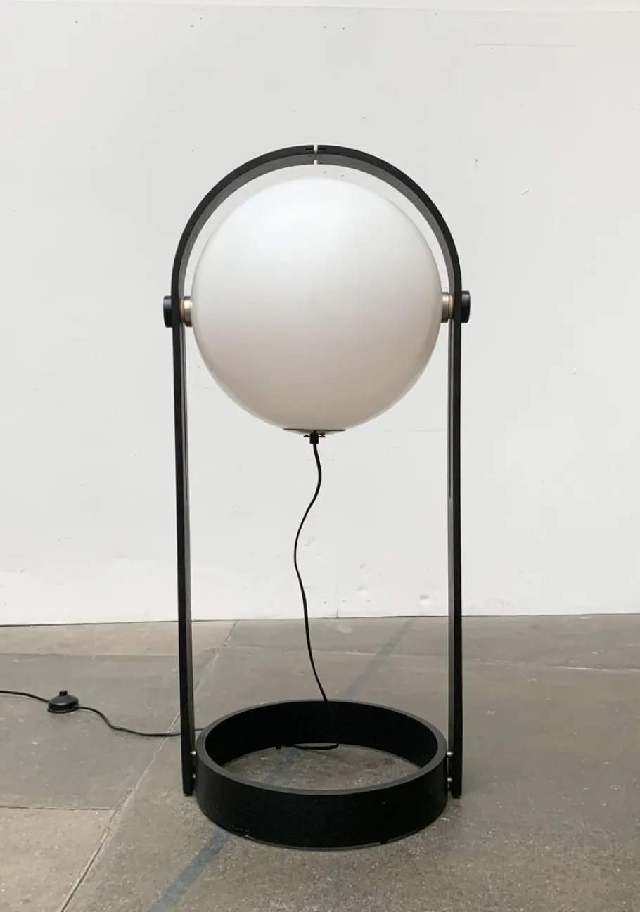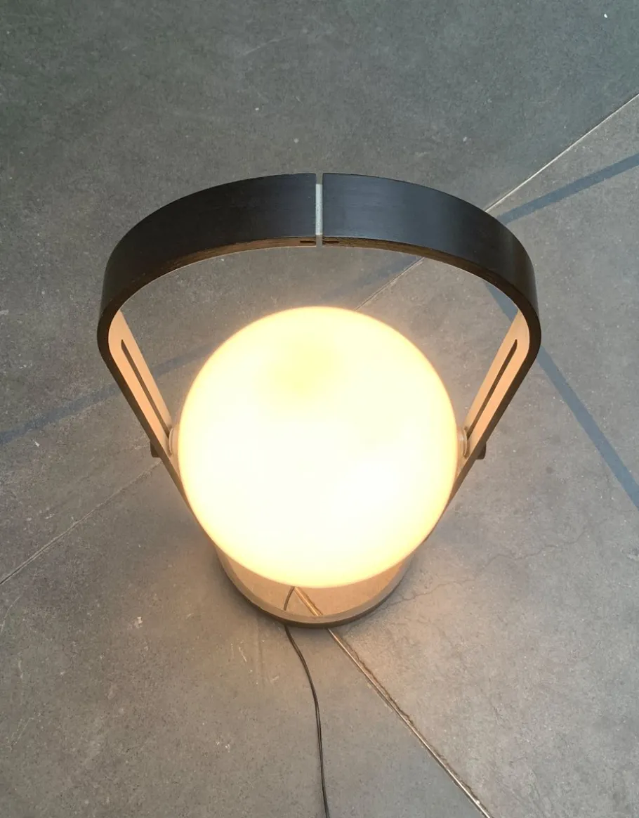 A functional light source and at the same time an imposing light object in the room. The lamp consists of an arch-shaped wooden frame in which a sphere is virtually clamped. The frame is finished in black. The base is dissolved in a fine ring of wood. The imposing diffuser sphere made of plastic can be adjusted in height and rotated. This is done by 2 oblong holes in the cheeks of the frame. It is fixed in place with 2 large wood screws.