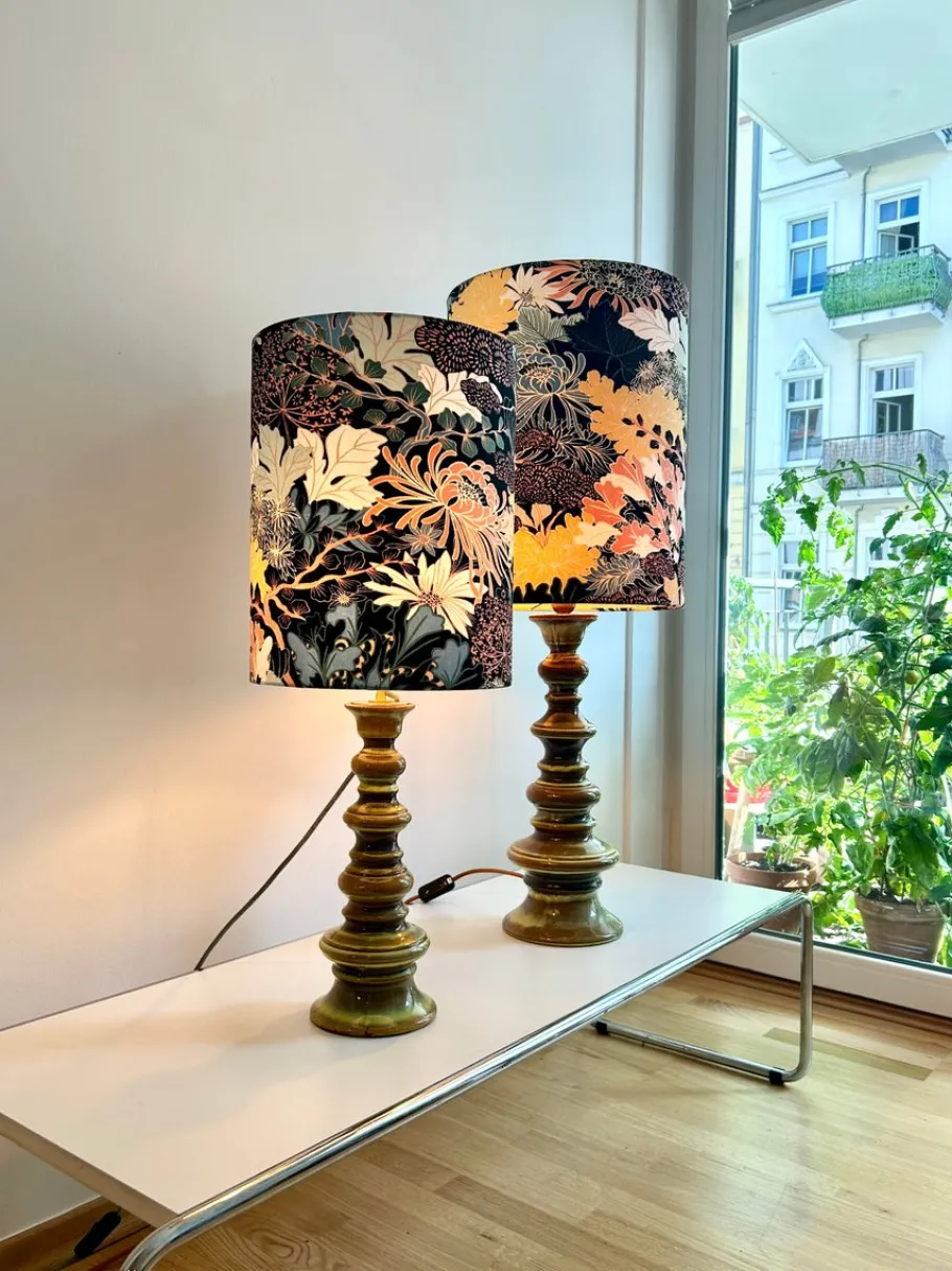 The cylindrical shades are covered with high-quality cotton canvas. The Japanese-inspired floral pattern in muted tones creates a particularly atmospheric effect as soon as the lamp is switched on: Lighter pattern elements begin to glow, while darker sections create depth and contrast – ideal for cozy, decorative lighting in the living room or bedroom.