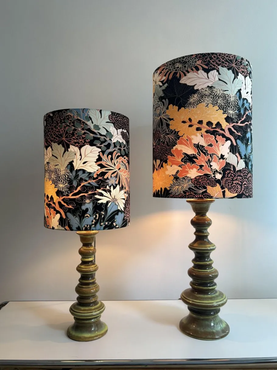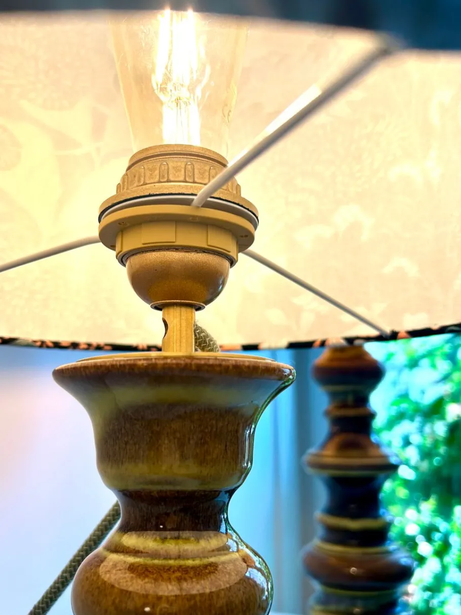 | Restoration and Damage Details | Large lamp made from an original vintage lamp base, Smaller lamp constructed from an original vintage candlestick, New wiring,Lampshades handcrafted to match the bases |