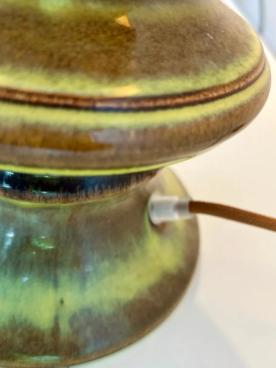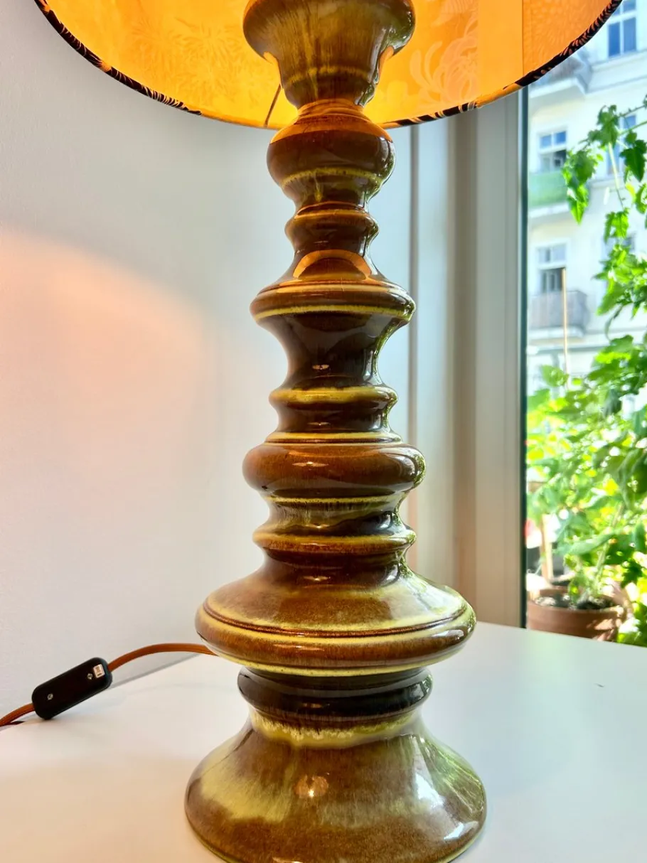 A stylish pair of mid-century lamps with high decorative value. West German Studio Ceramics / West German Pottery. Technically completely overhauled. These two striking table lamps most likely originate from West German ceramic production in the 1960s/70s – stylistically belonging to the Fat Lava era. The bases are made of glazed ceramic in shimmering olive green with lighter accents and typical sculptural wave shapes – also known as pagoda shapes. The craftsmanship is reminiscent of designs by Hustadt Lamps or Dümler & Breiden Ceramics from this period – both known for their expressive mid-century lamps. However, the two bases could also be of English origin. The manufacturer Royal Doulton is known for similar shapes with its Sheerlite lamp.