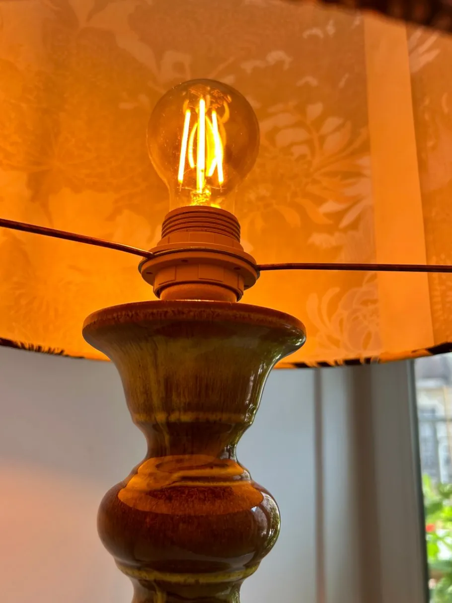 Electrical system: newly installed with an olive-green textile cable, European plug, toggle switch, and a copper-colored E27 socket. Professionally installed and tested by an electrician. Condition: excellent.