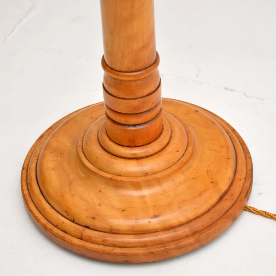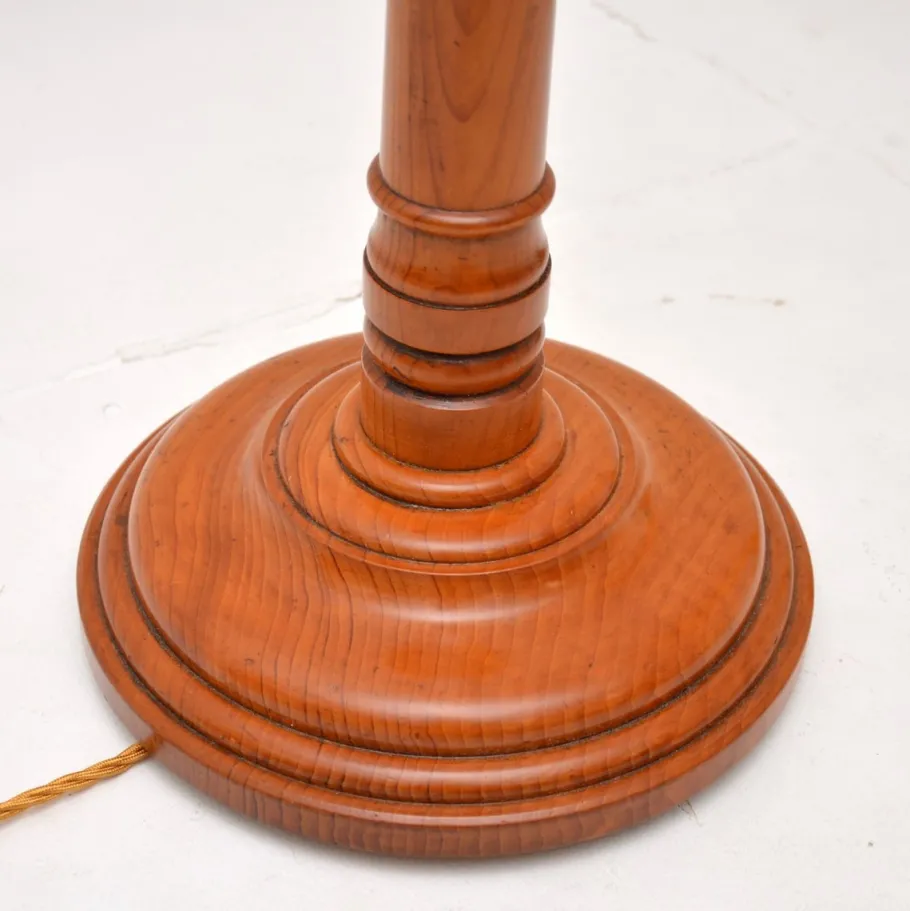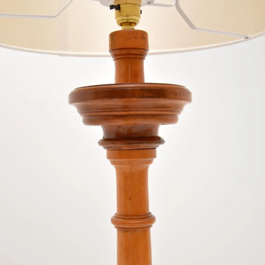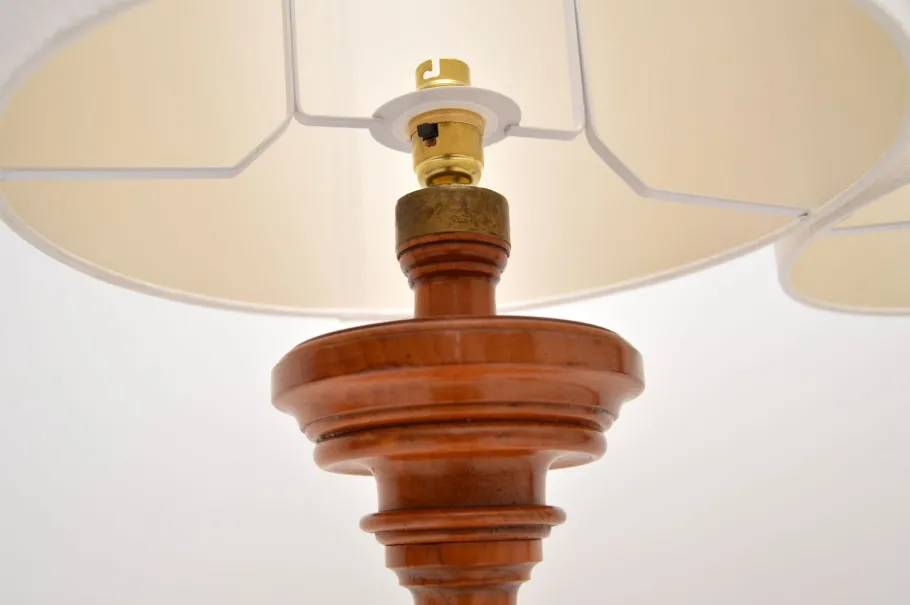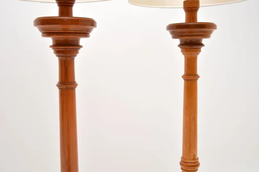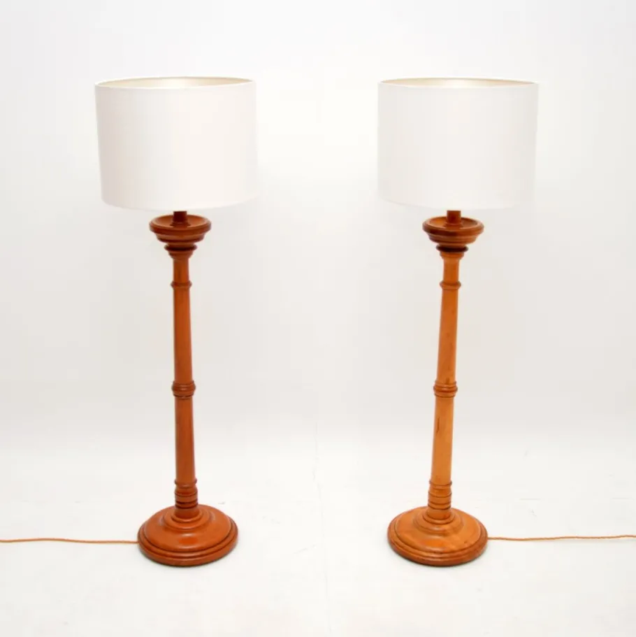 They were probably originally large candle sticks that have been converted to electrical lamps. One is solid elm, the other is solid satin wood, one may be have been made to match at a slightly later stage. They are identical in size and design, both have a lovely colour tone and patina.