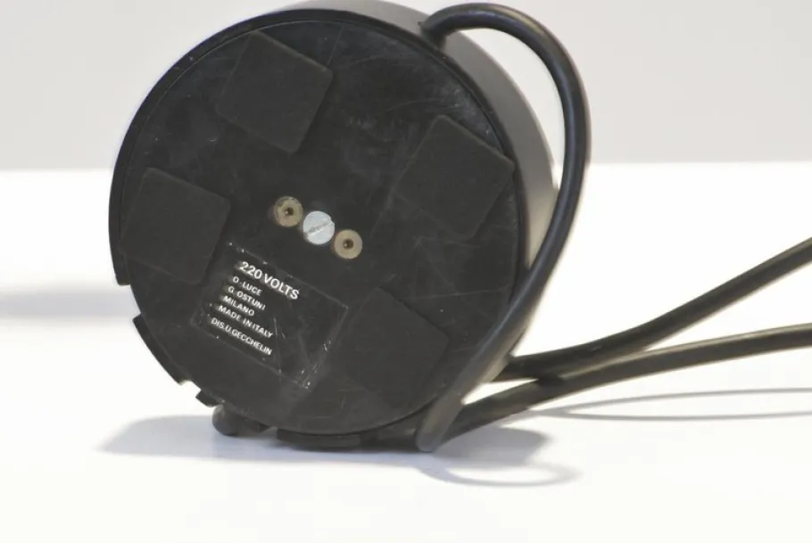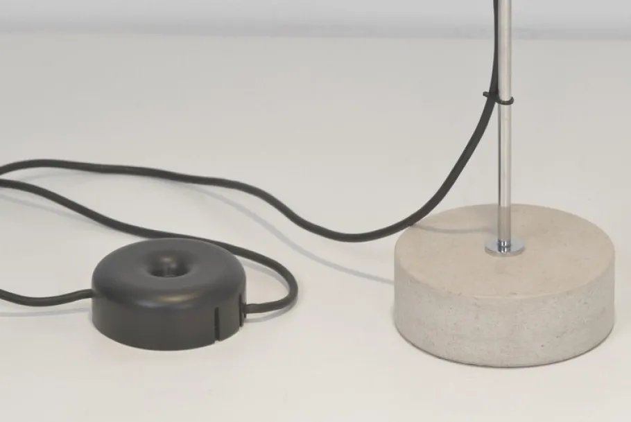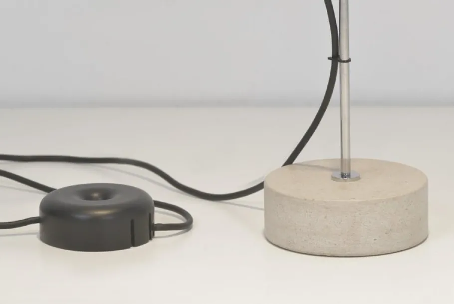 Minimalist design. The lamp head is vertically adjustable around the chrome-plated central rod above the travertine base. The ring-shaped switch is located on the lamp head and is identifiable by its ribbed design. The ring-shaped transformer, which is also labeled on the underside, is located on the connection cable. this Object: from the “WING” lighting series, we present the rare floor lamp with a travertine base. Bruno Gecchelin has been collaborating with the renowned manufacturer O-Luce by Giuseppe Ostuni in Milan since 1968. One of the first halogen lamps designed by Gecchelin for O-Luce was created in 1971: the WING series. The movable lamp head made of thermoplastic material and the integrated switch on the lampshade are characteristic of this series. The construction with a single molded part was both economical and elegant – Gecchelin deliberately designed the lamp to be compact and heat-resistant.