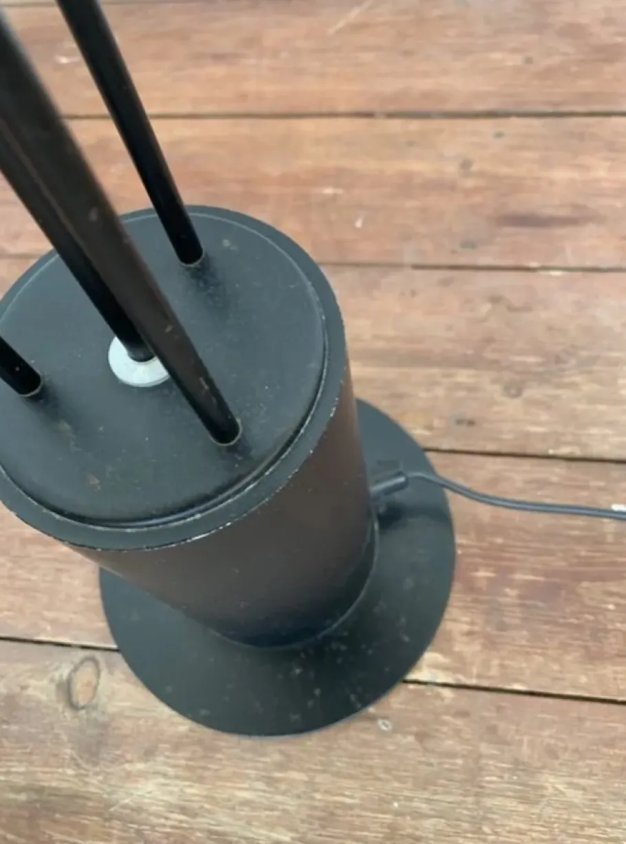 Concealed behind three metal rings, the bulb projects an ascending light that meets a first reflective surface whose central opening allows a beam of light to pass through and collide with a disc that distributes a soft peripheral light.
