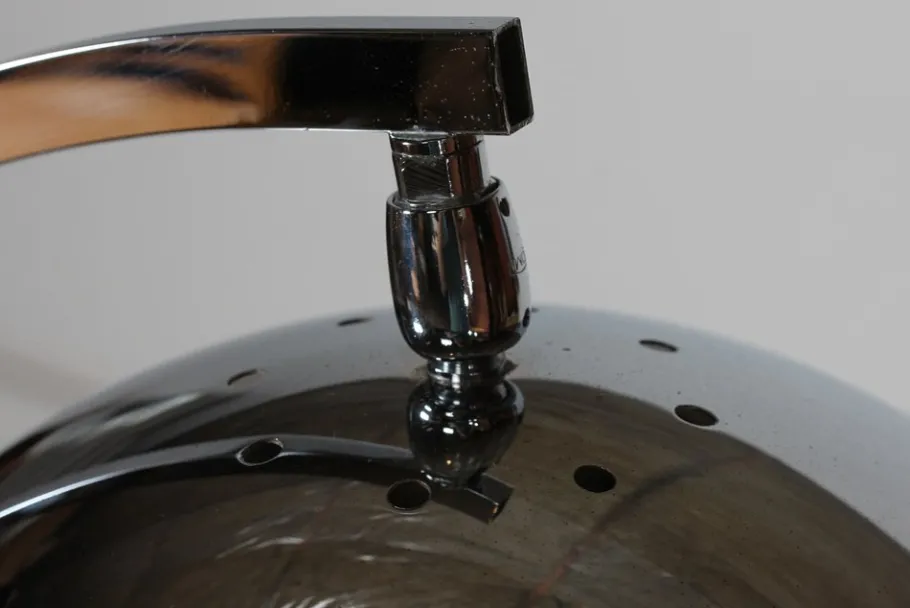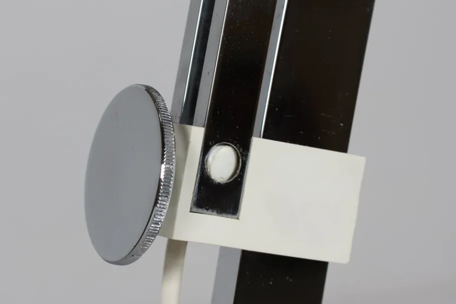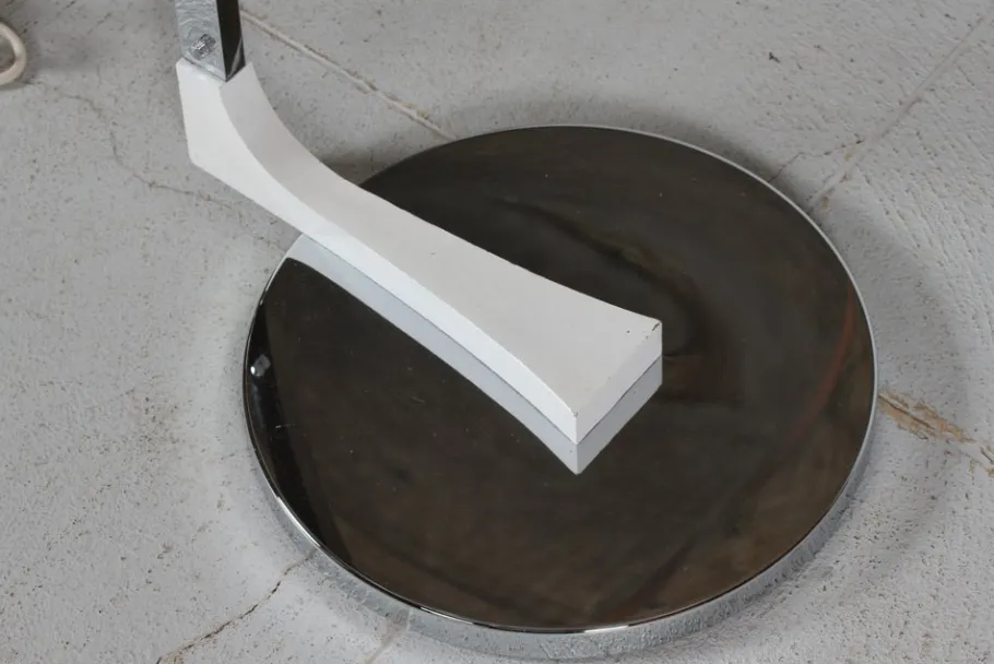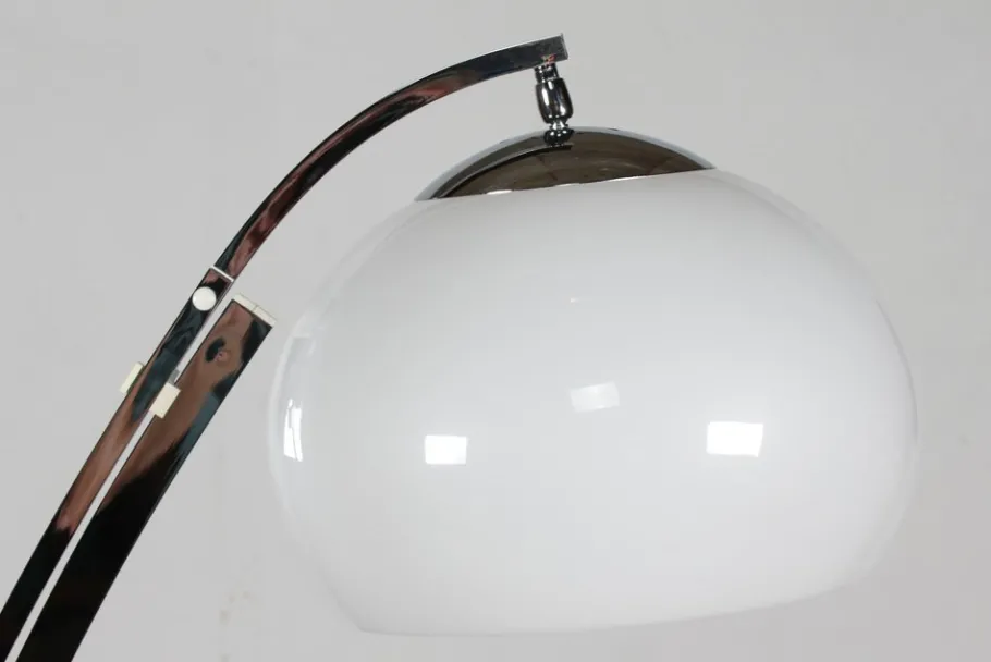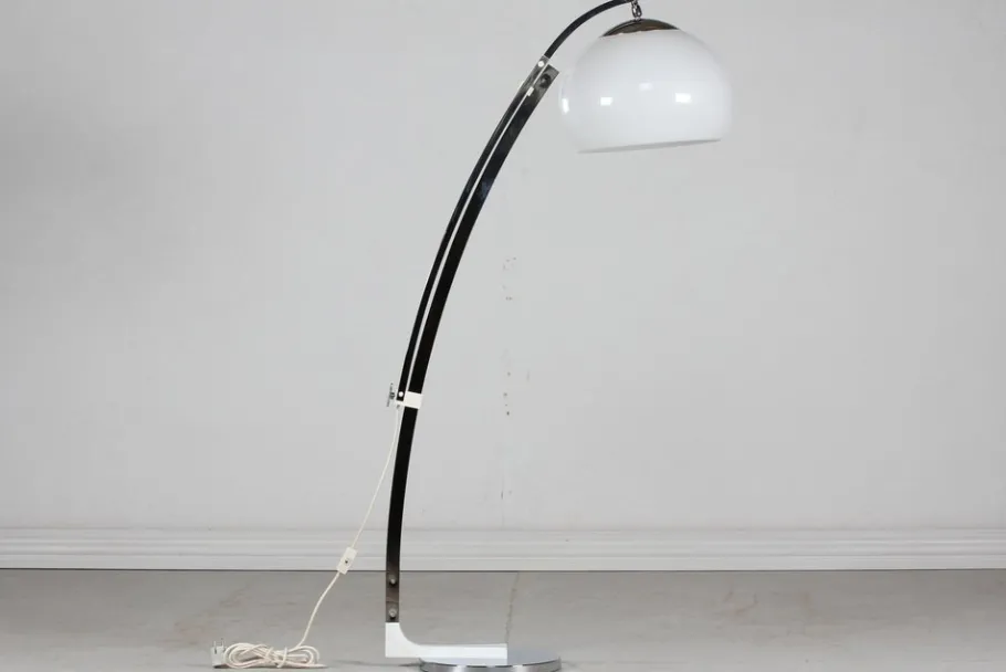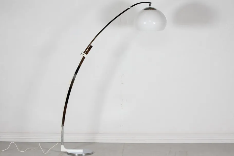 The bow shaped floor lamp has a long height adjustable arm made of chromium-plated metal and metal with white lacquer.
