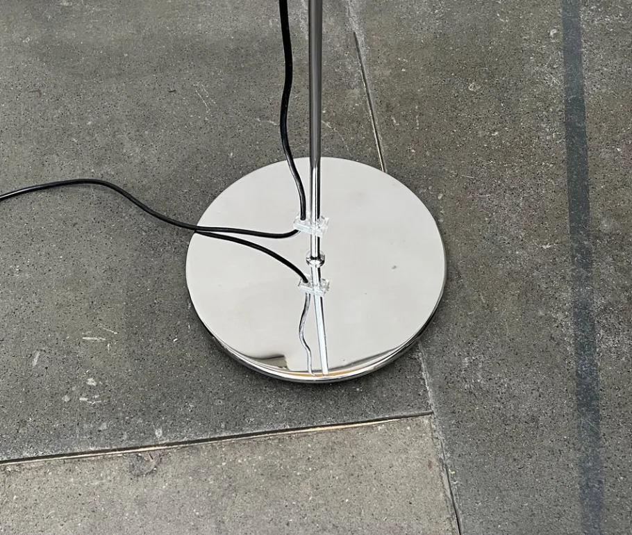 A classic design from the time. The balloon -shaped plastic screen is yellow on the outside and white on the inside. The umbrella is held on the top of a bracket connected to the frame element. It can be moved freely on the chrome rod of the shaft, which gives the lamp different phenomena and lighting effects. A knacker ring serves to fix on the light head. A special feature is the big plate foot. The edge is carried out with a supernatant, so that a shadow joint is created on the ground. The cable is run by two acrylic elements on the shaft.