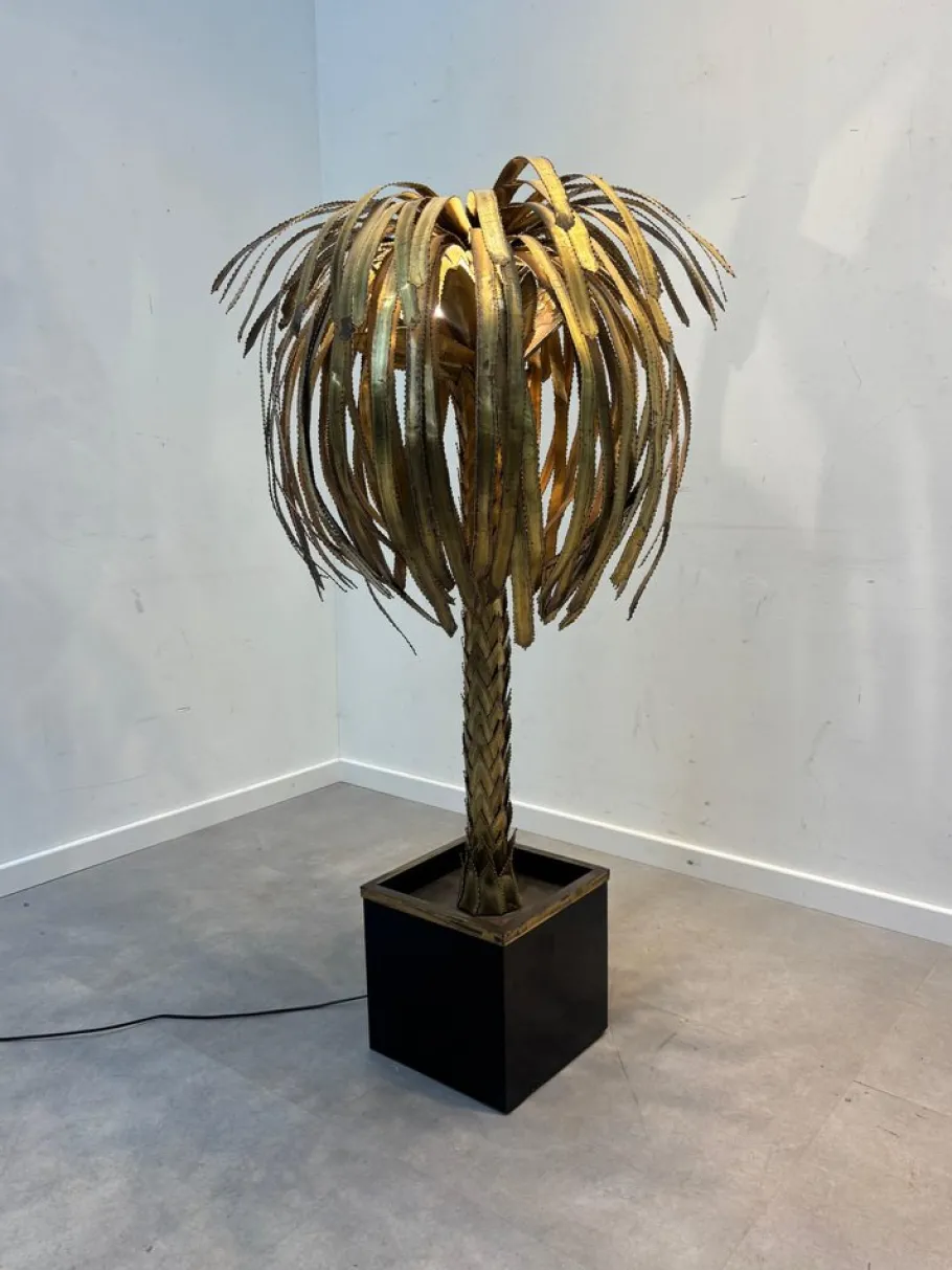 Dimensions: Approx. 140cm height Features: Striking palm tree silhouette Intricately detailed fronds and braided trunk Mounted on a glossy black square base Original wiring with foot switch (can be rewired upon request) Condition: Very good vintage condition with minor signs of age-appropriate wear Provenance: Sourced from a private European collection This rare collector’s piece doubles as a functional floor lamp and a sculptural work of art, perfect for luxe interiors, eclectic decors, or vintage modern spaces.
