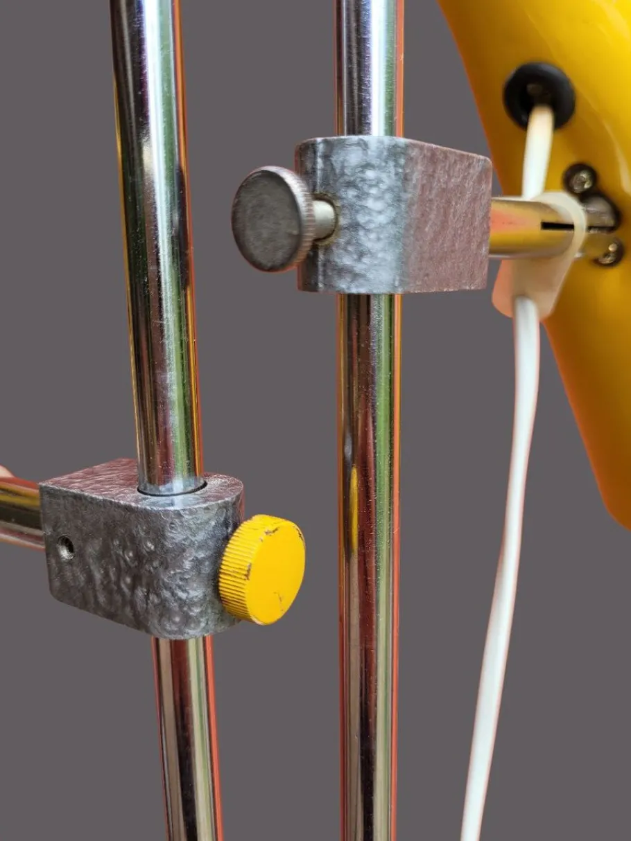 This rare mid-century floor lamp dates back to the 1960s and was designed by renowned Czech designer Josef Hůrka for Lidokov. Its distinctive features include two pivoting, conical shades, a chrome-plated frame, and a heavy metal base – a functional design object with high design quality.