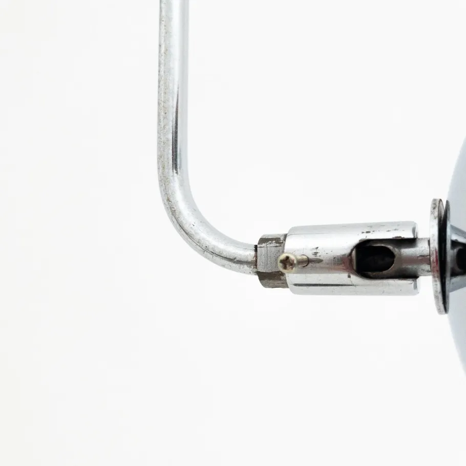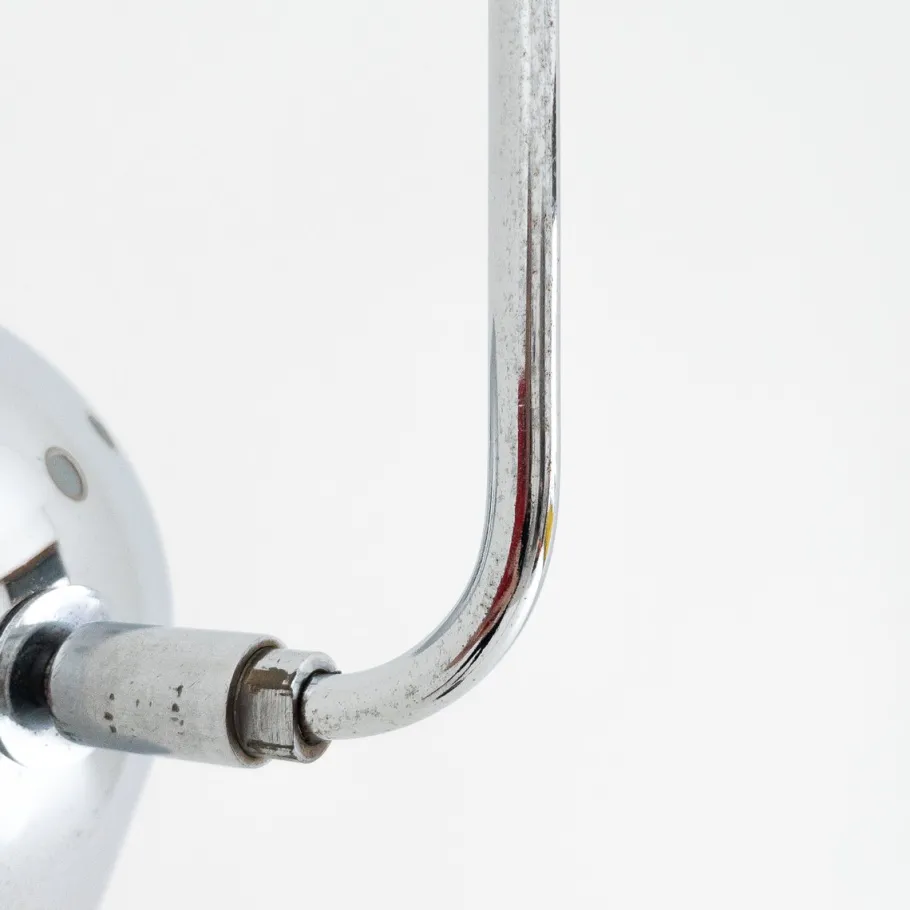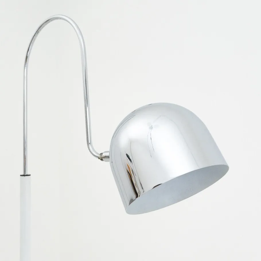 The lamp stem rises elegantly from the base, divided into two parts: the first half is in white painted metal, while the upper part is in chromed metal, creating a fascinating visual contrast. This structural design offers a pleasant harmony between shapes and materials.